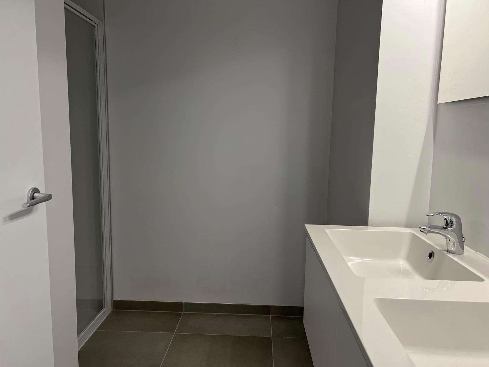 - Badkamer ((2,20m x 1,40m) + (1m x 1m) =4,08 m²): Badkamermeubel met spiegels, lavabo, dubbele spoelbak en onderkasten, tegelvloer.