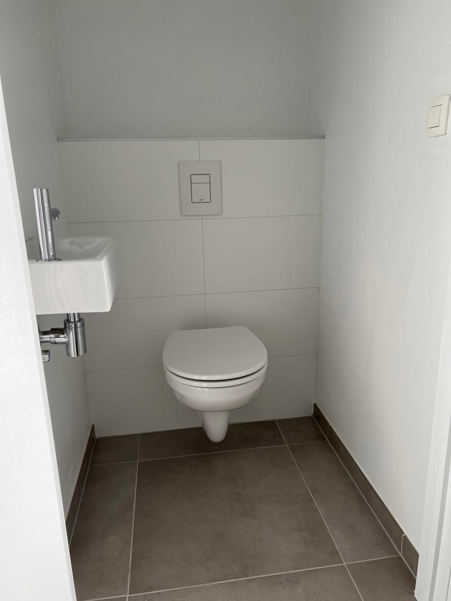 - Apart toilet (0,98m x 1,18m = 1,16m²): Hangtoilet, wastafel, tegelvloer.