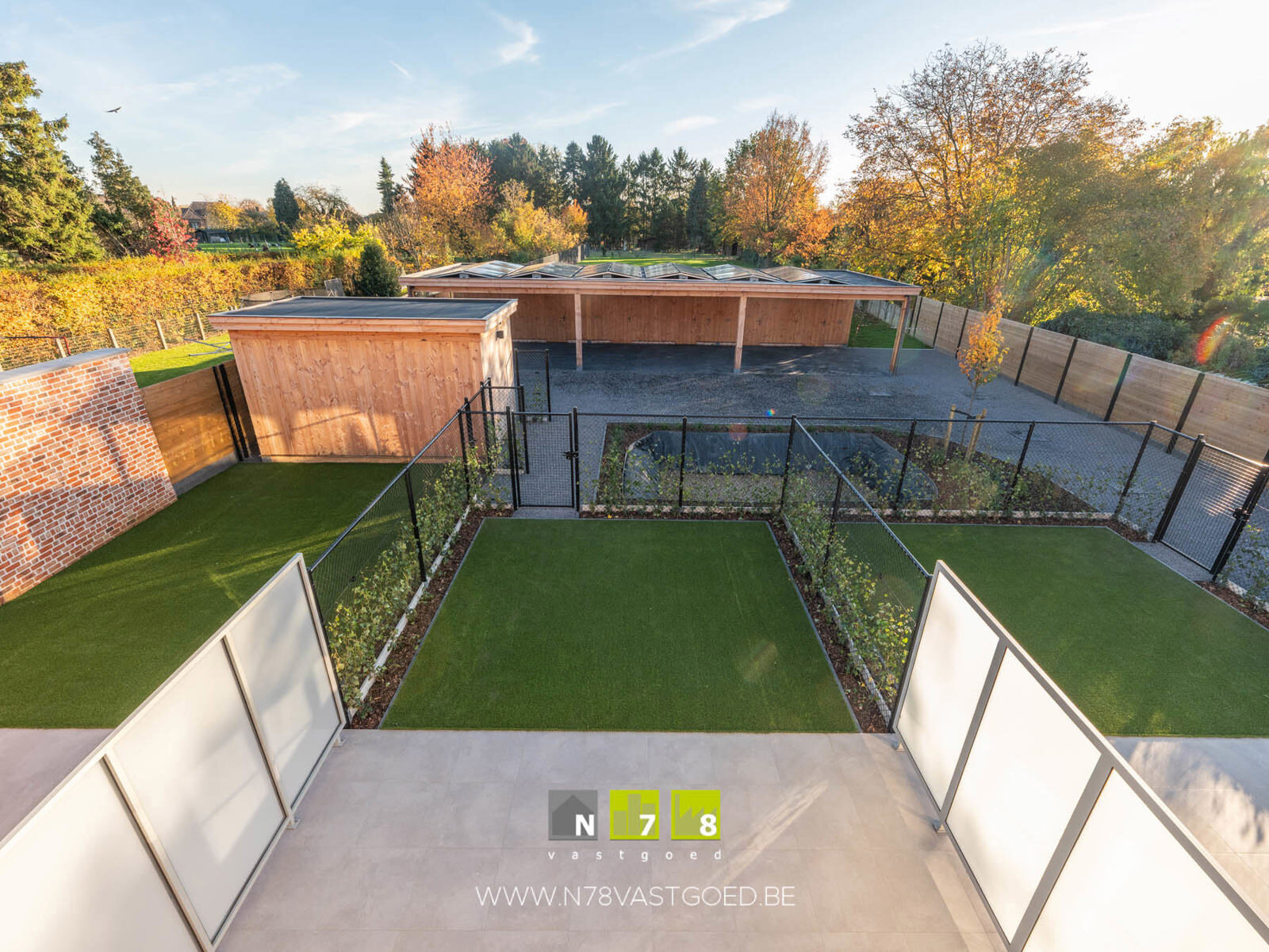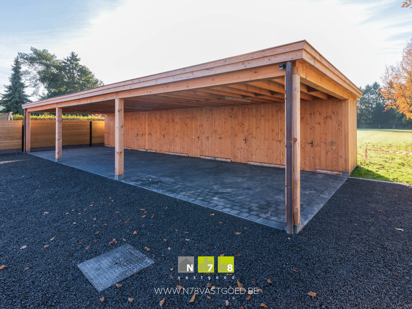 - Carport met afgesloten bergruimte alsook een fietsenstalling (de carport heeft een voorinstallatie voor een laadpaal en de omsloten ruime fietsenstalling heeft stopcontacten voor oplading).