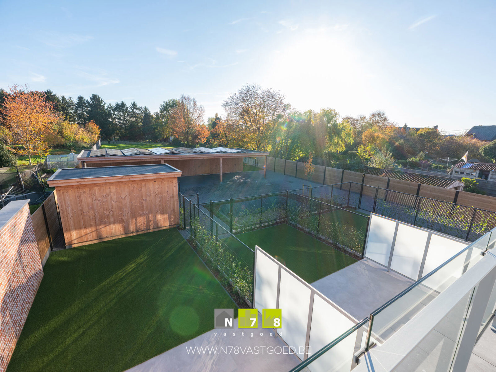 - Carport met afgesloten bergruimte alsook een fietsenstalling (de carport heeft een voorinstallatie voor een laadpaal en de omsloten ruime fietsenstalling heeft stopcontacten voor oplading).