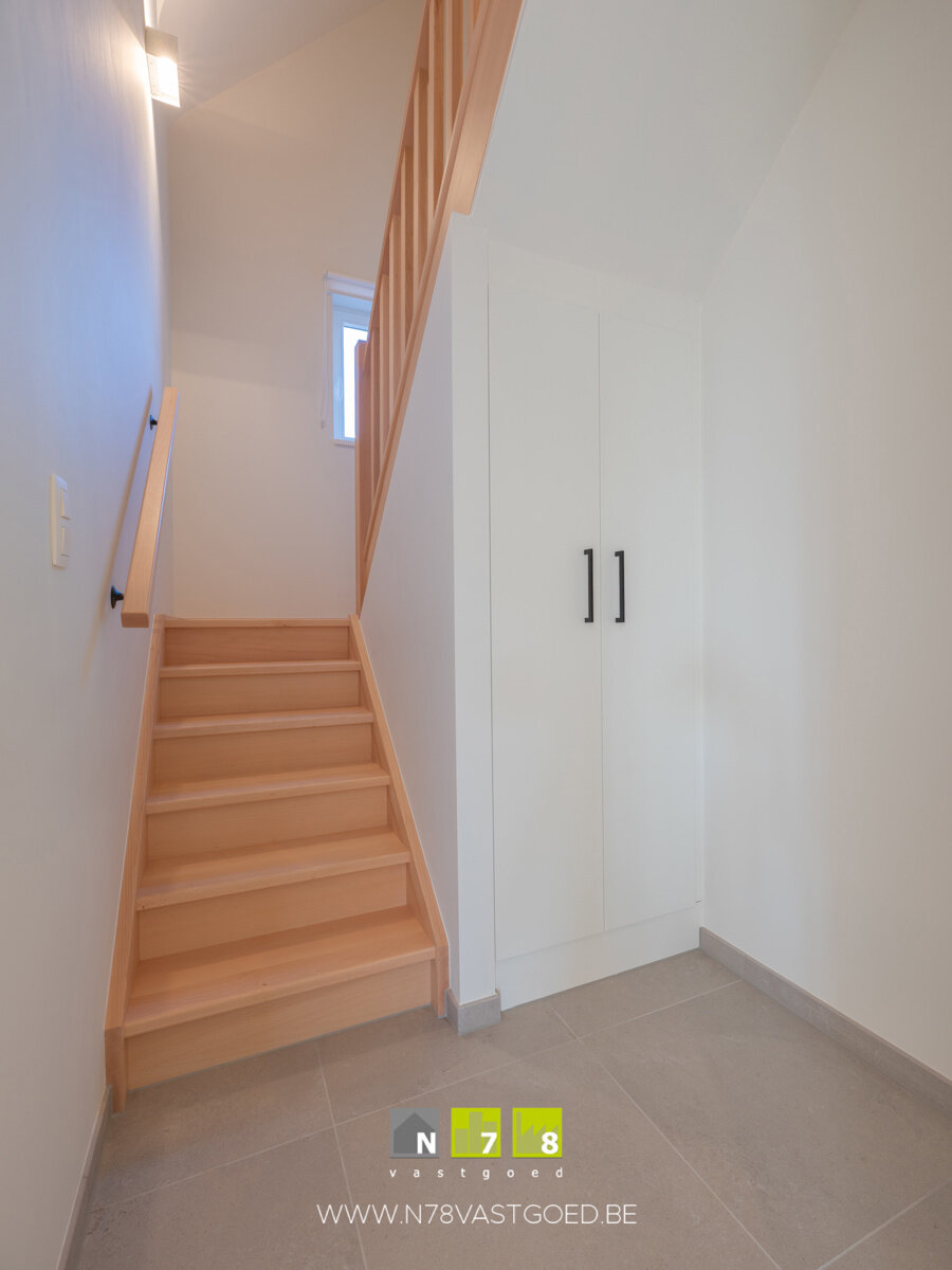 - Inkomhal (6,31m²): inbouwkast, toegang tot het 2de verdiep, tegelvloer.