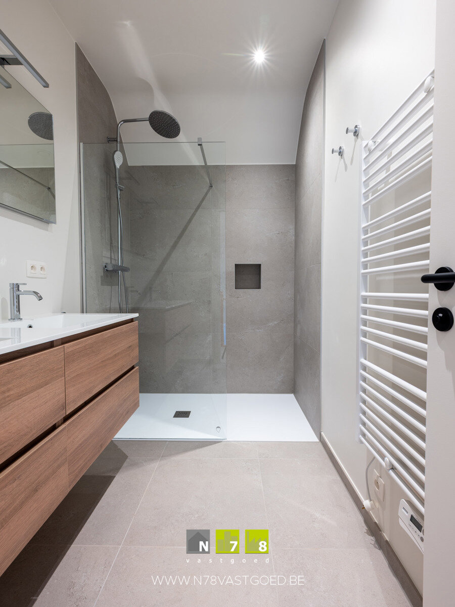 - Badkamer (4,82m²): inloopdouche, dubbele lavabo, tegelvloer.