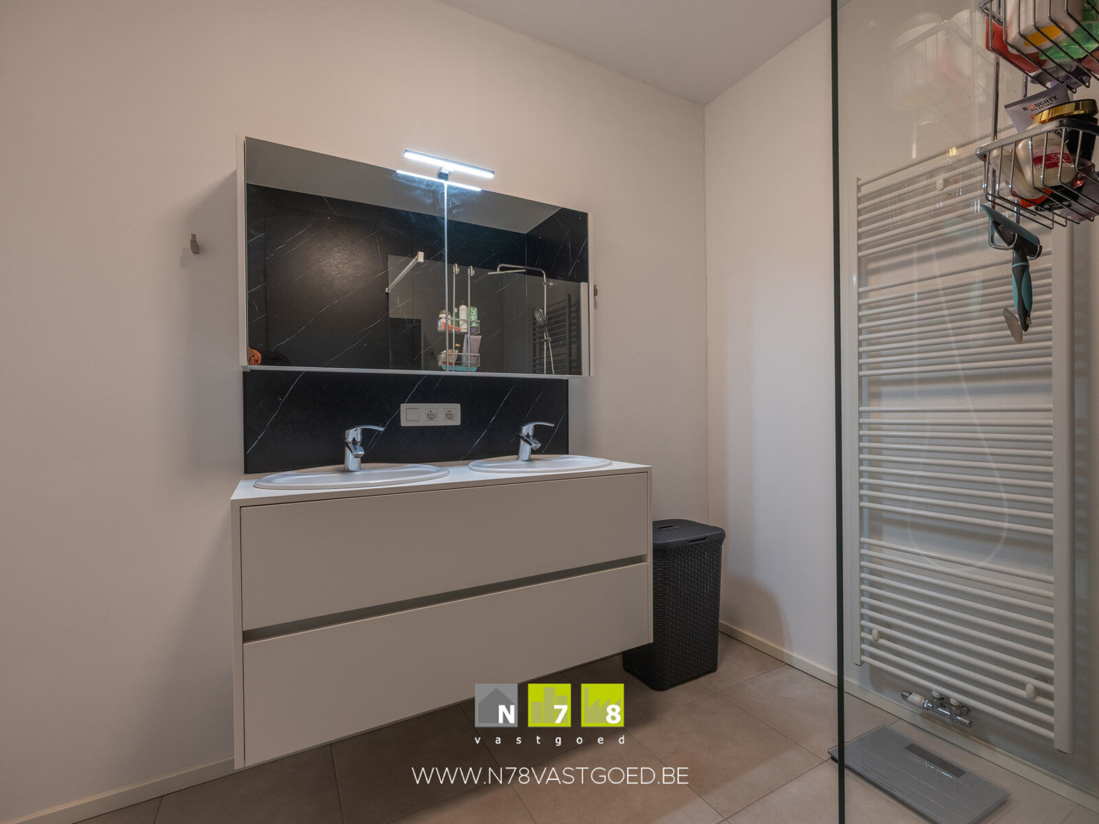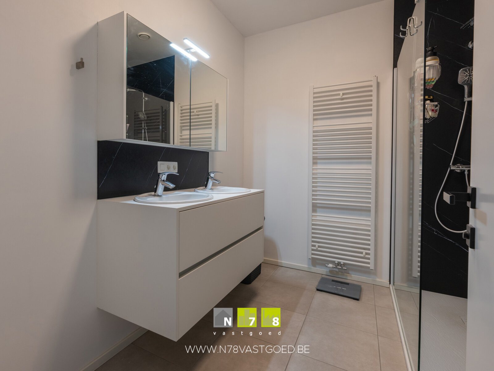 - Badkamer ((2,90m x 1,50m) + (2,30m x 0,95m) = 6,54m²): badmeubel met dubbele lavabo, onderlades, spiegelkasten, verlichting; inloopdouche, design radiator, tegelvloer.