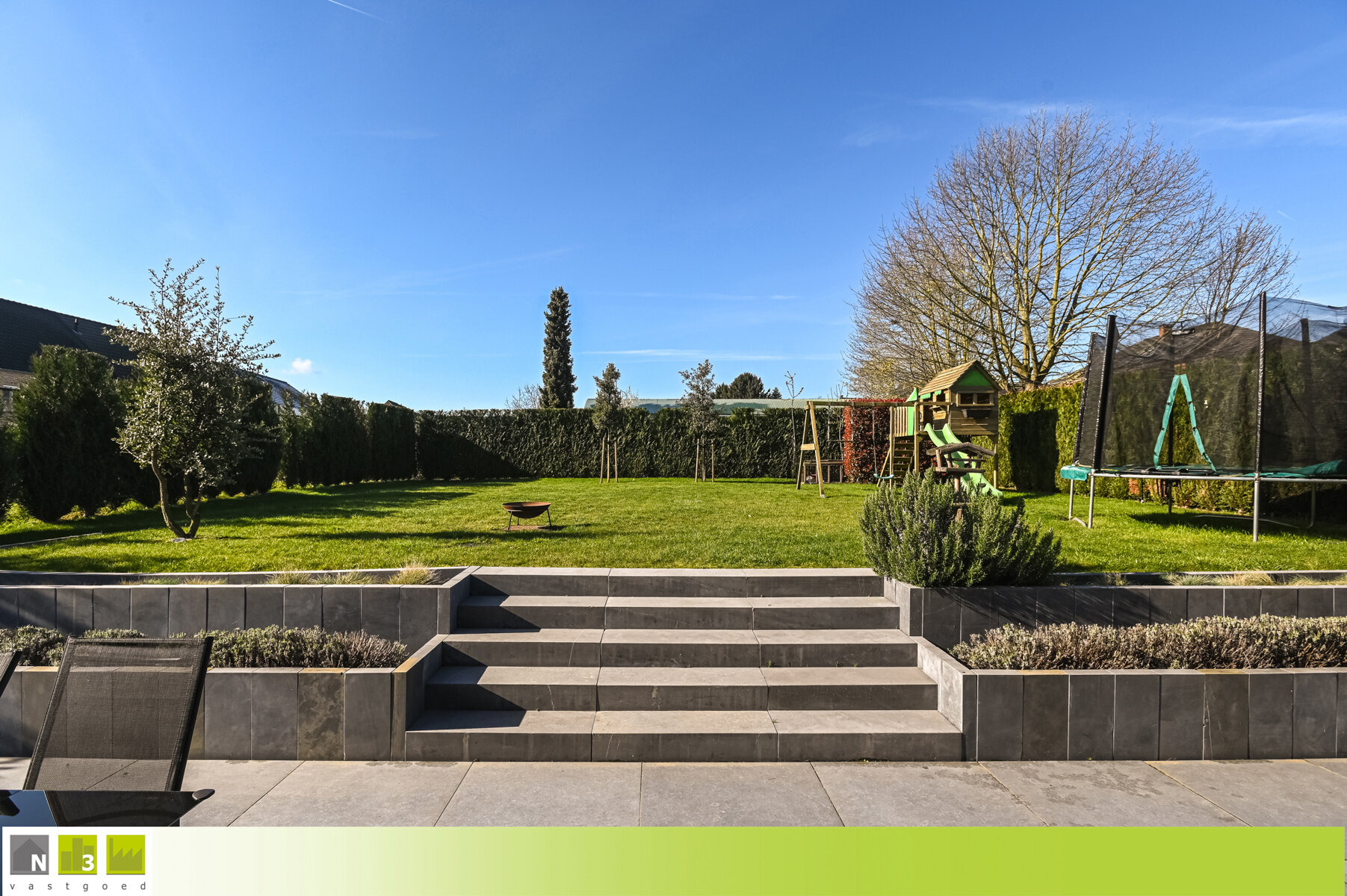 - Tuin: zuidwestelijk georiënteerde tuin, volledig omheind met draad, en mooi aangelegd met gras en beplanting.