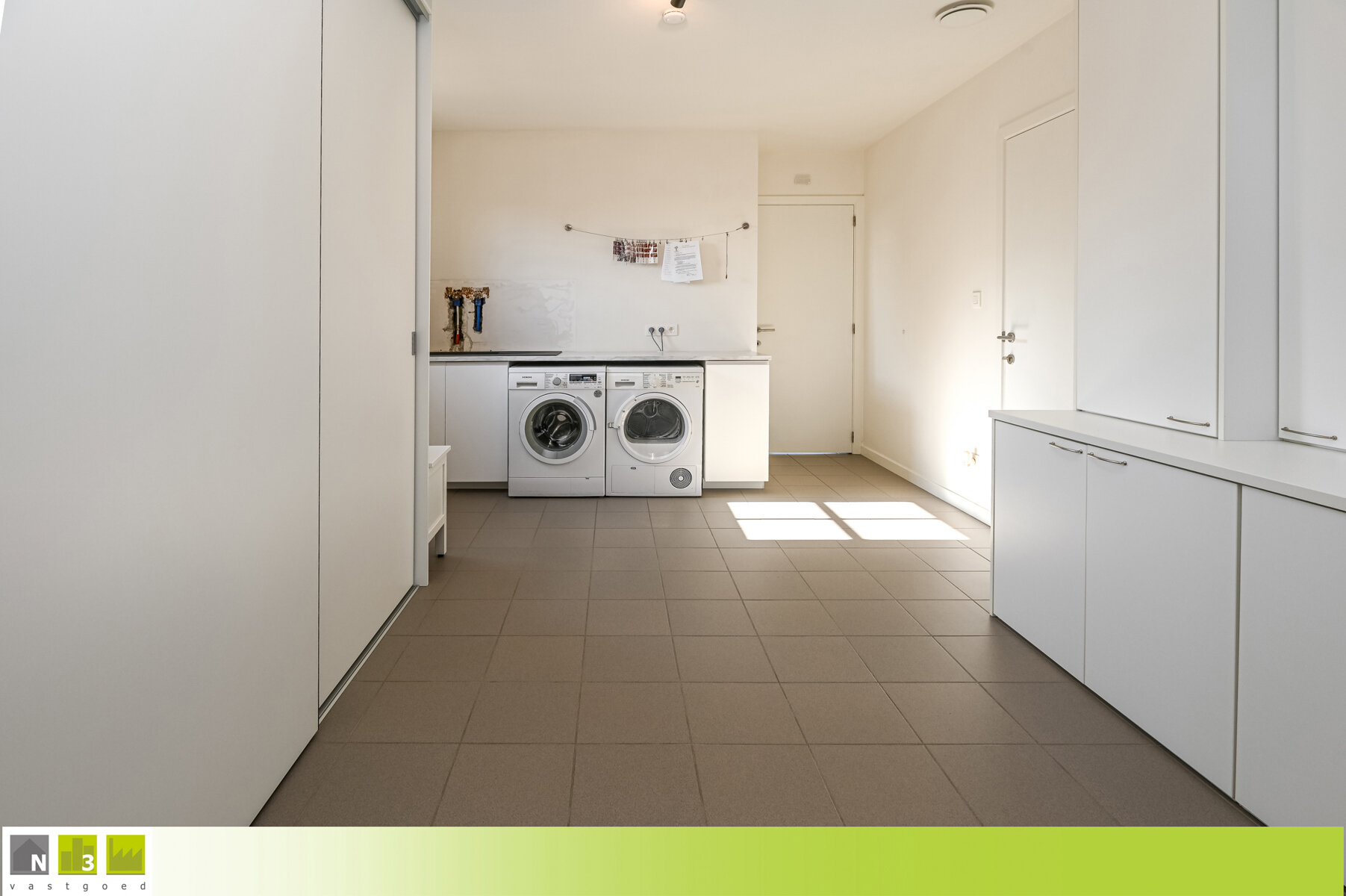 - Wasplaats/berging (15m²): 3.48x2.76m + 2.34x2.50m voorzien van inbouwkasten, een uitgietbak, aansluiting wasmachine en een buitendeur.