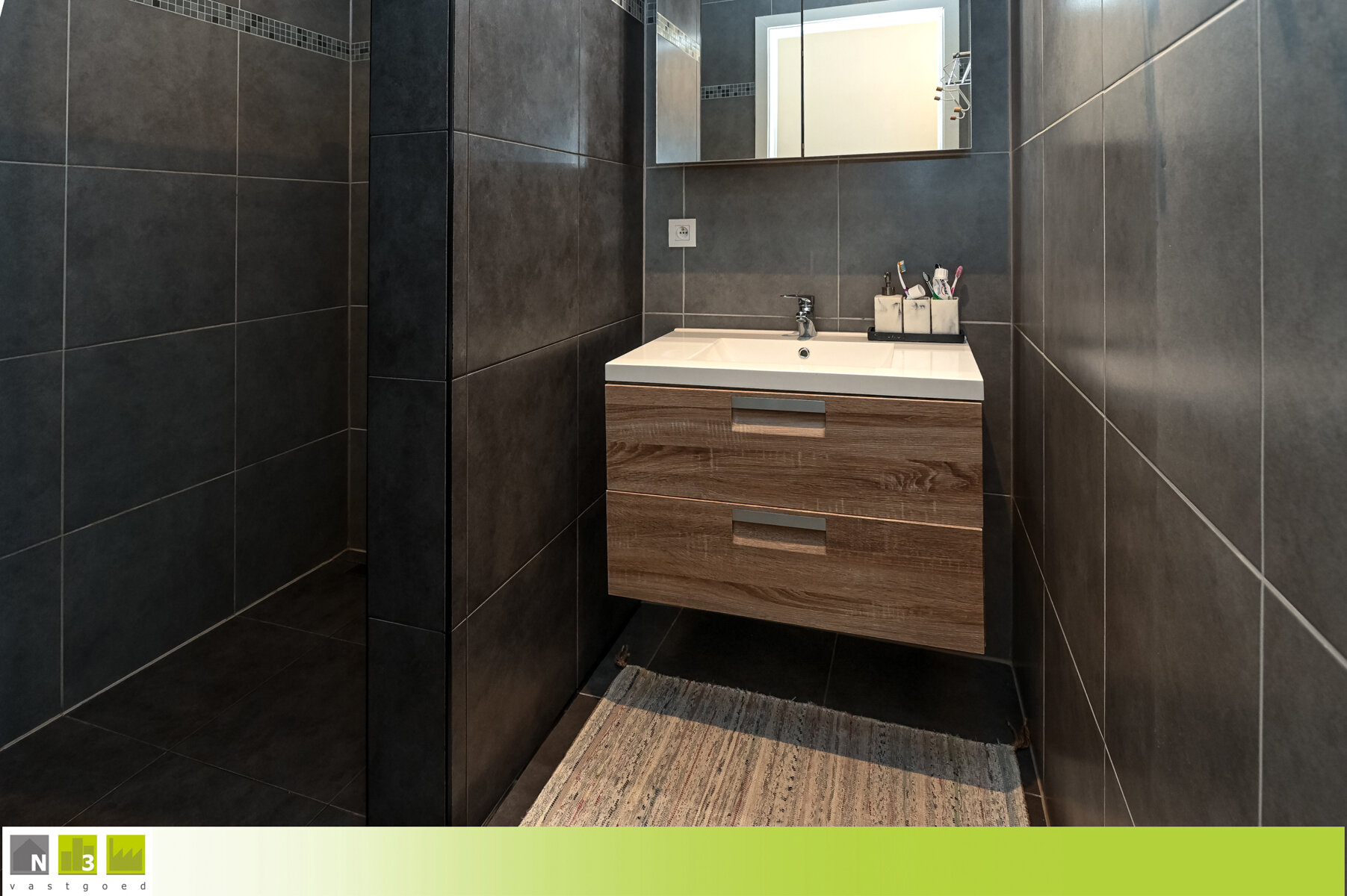 - Badkamer (3.60m²): 2.00x1.80m, uitgerust met een inloopdouche en een badkamermeubel met lavabo. Ruimte voorzien van volledige wandbetegeling en ventilatiesysteem.