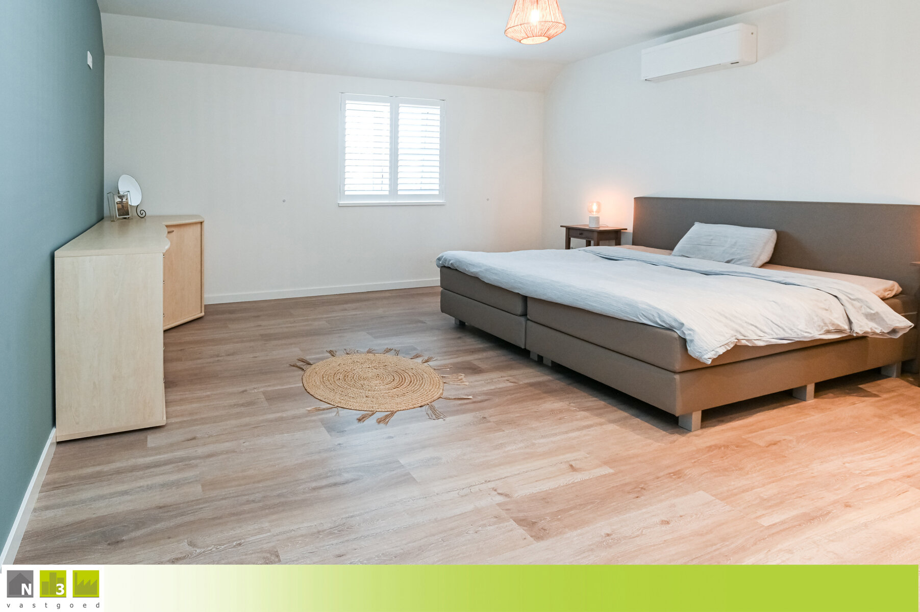 - Slaapkamer 1 (20m²): 4.66x4.30m, voorzien van airco (warm/koud), aansluiting radiator, TV- en internetaansluiting, inbouwspots en een raam met vliegenraam en shutters.
