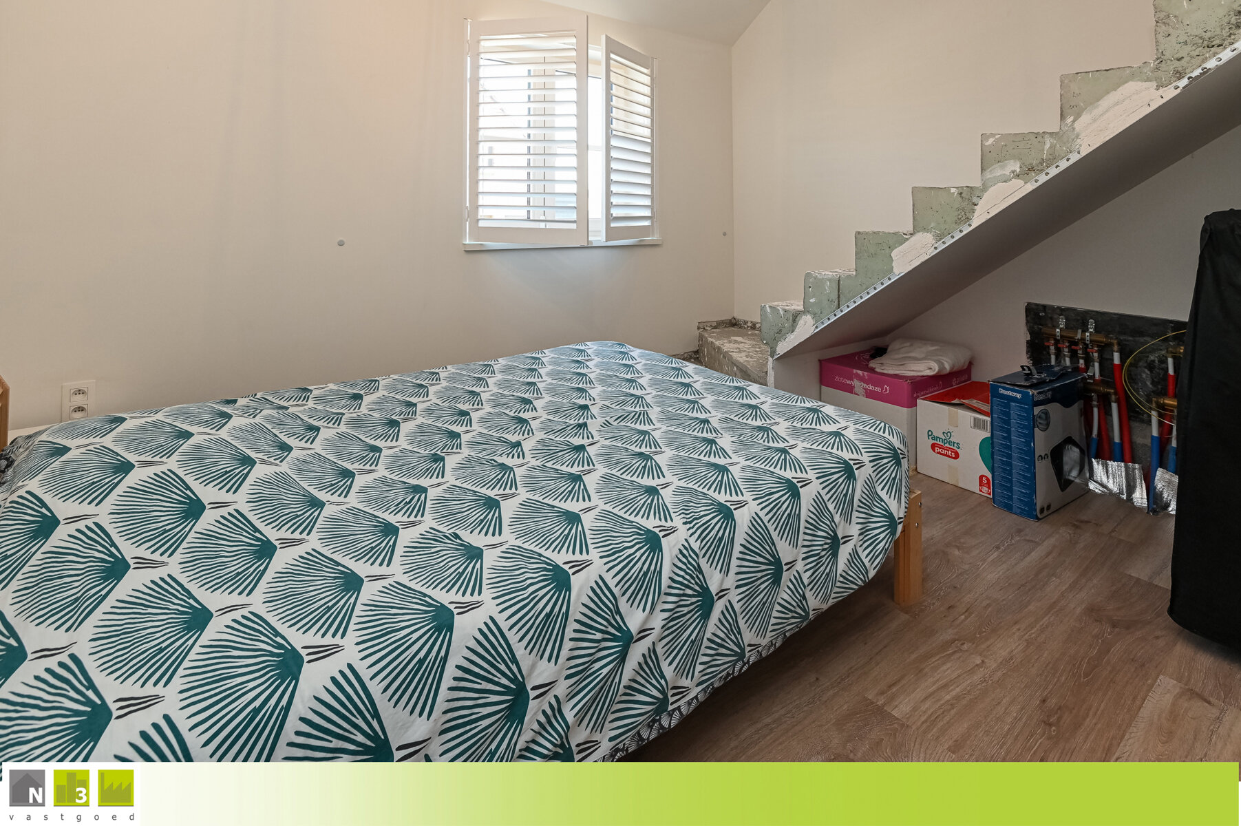 - Dressing/slaapkamer 4/berging (10m²): 3.70x2.76m met de vaste trap naar de zolder en voorzien van aansluiting radiator en een raam met vliegenraam en shutters.
