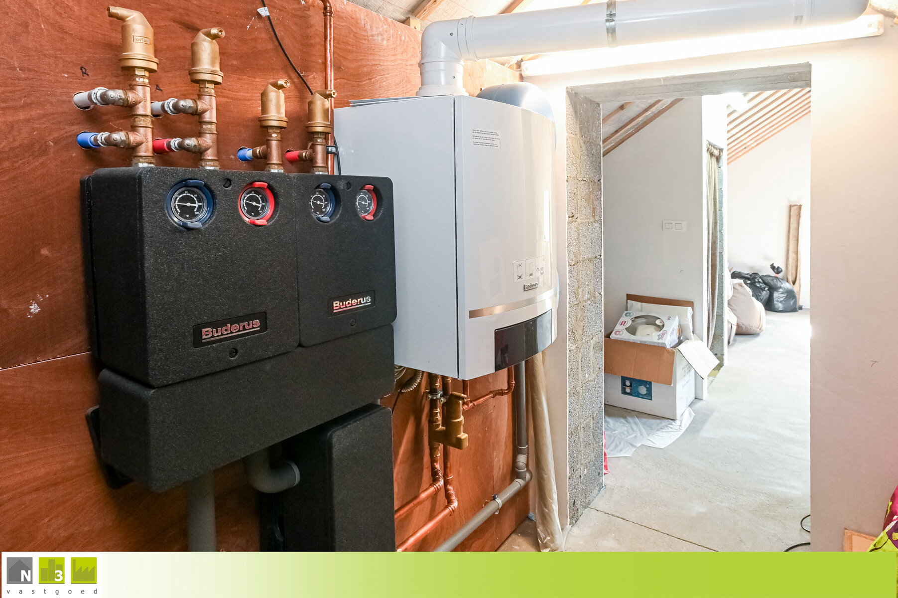 - Zolder 2/technische ruimte (21m²): 4.71x4.44m. Hier hangt het ventilatiesysteem type D en de Buderus condenserende aardgasketel met aparte boiler.