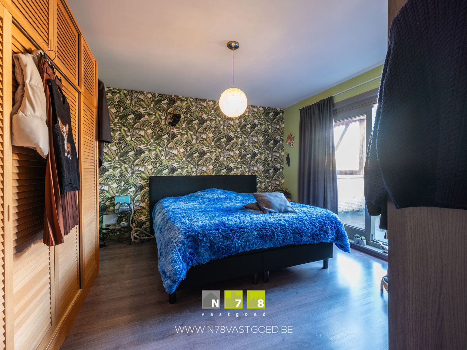 - Slaapkamer 1 (3,50m x 3,85m = 13,30m²): doorgang naar aansluitende dressing (2,40m x 2,80m = 6,72m²), laminaat.