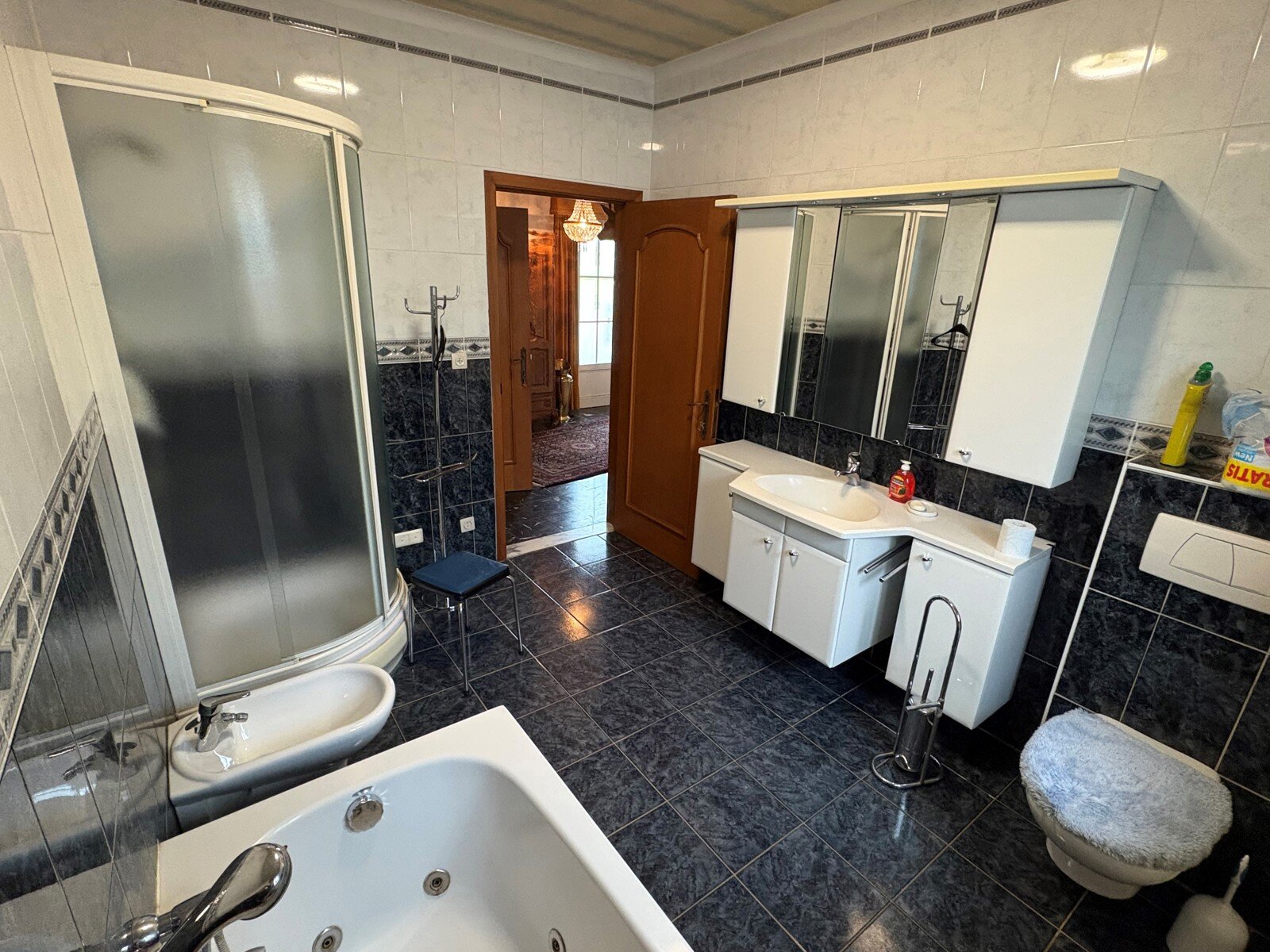 - Badkamer (9m²): 3.50x2.50m, uitgerust met een jacuzzi/ligbad, een douche, een bidet en een badkamermeubel met een lavabo en kasten. Ruimte voorzien van volledige wandbetegeling, een raam met rolluik en tegelvloer.