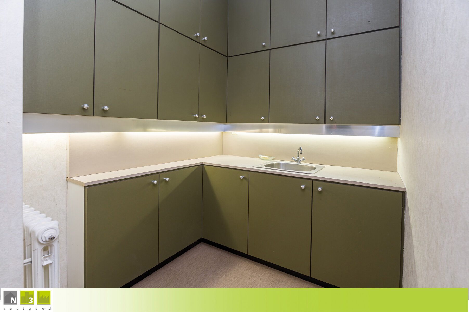 - Consultatie/bureelruimte (35m²): 5.50x4.50m met een aparte kitchenette (3.50m²: 2.00x1.70m voorzien van kasten en een lavabo) en een aparte berging (5m²: 2.40x2.00m).