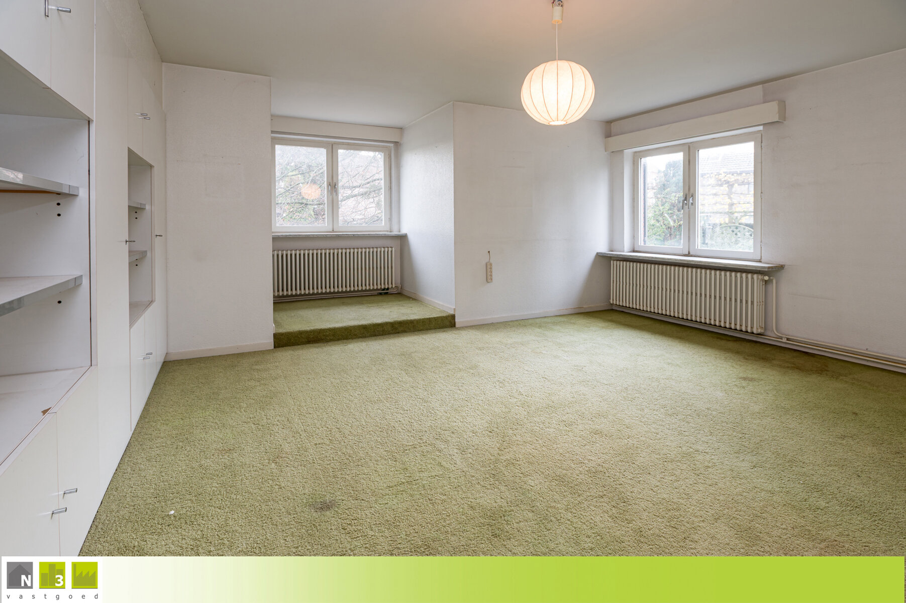 - Leefruimte (81m²): 12.50x6.50m onderverdeeld in een living voorzien van een kastenwand met open haard in een marmeren schouw (vast tapijt) en een woonkamer met toegang tot 2 overdekte terrassen (parketvloer).