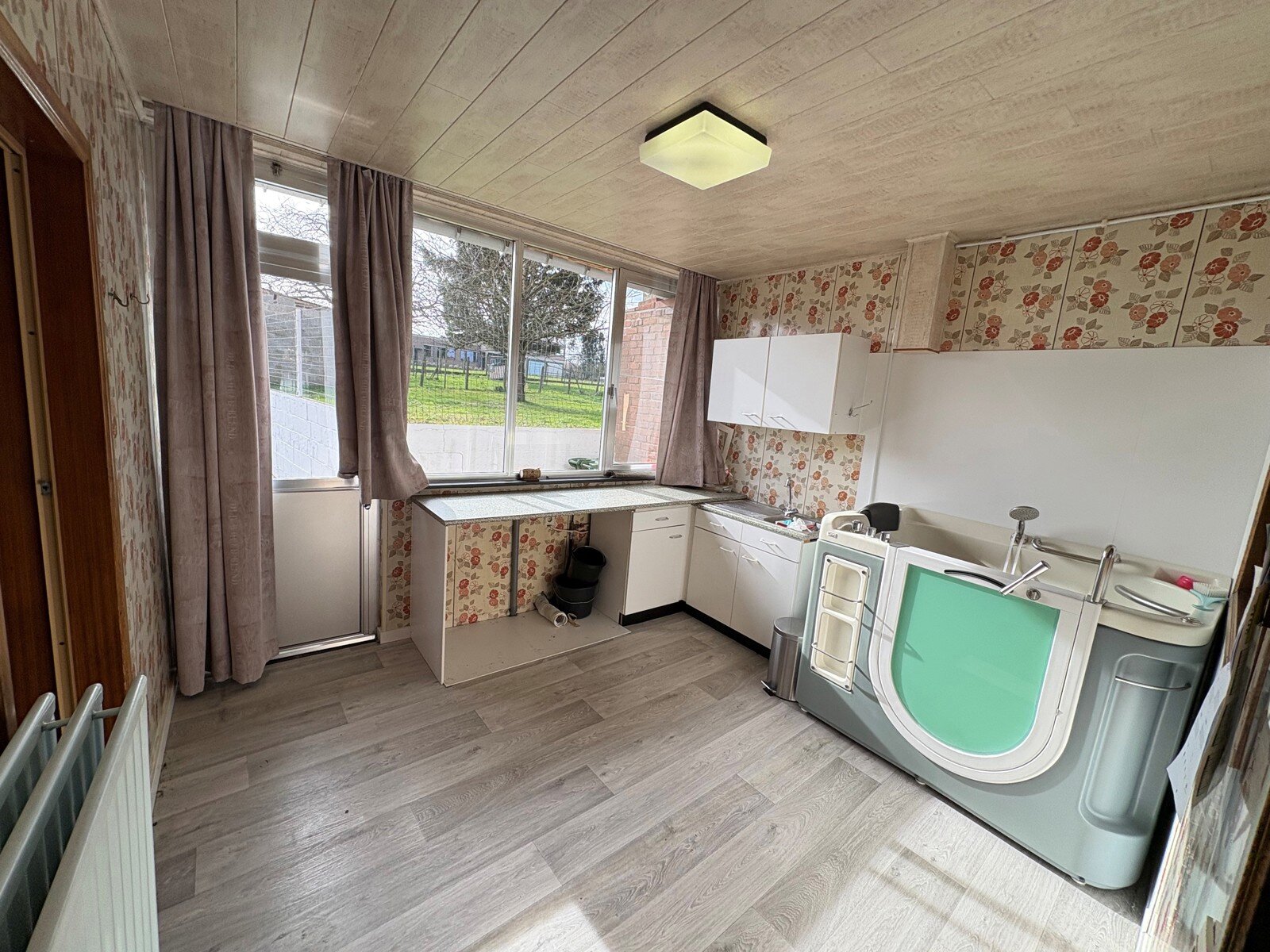 - Wasplaats (10m²): 3.50x3.00m met een zitbad/jacuzzi, aansluiting wasmachine en droogkast, een uitgietbak en nog een buitendeur naar de tuin/terras. Laminaatvloer.