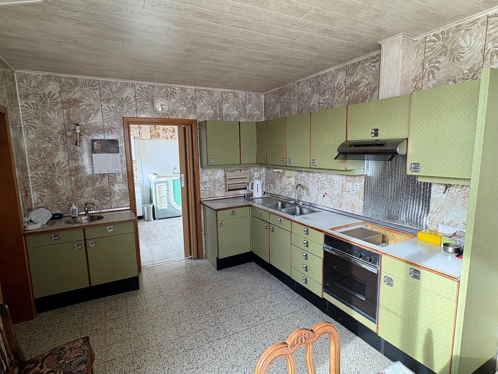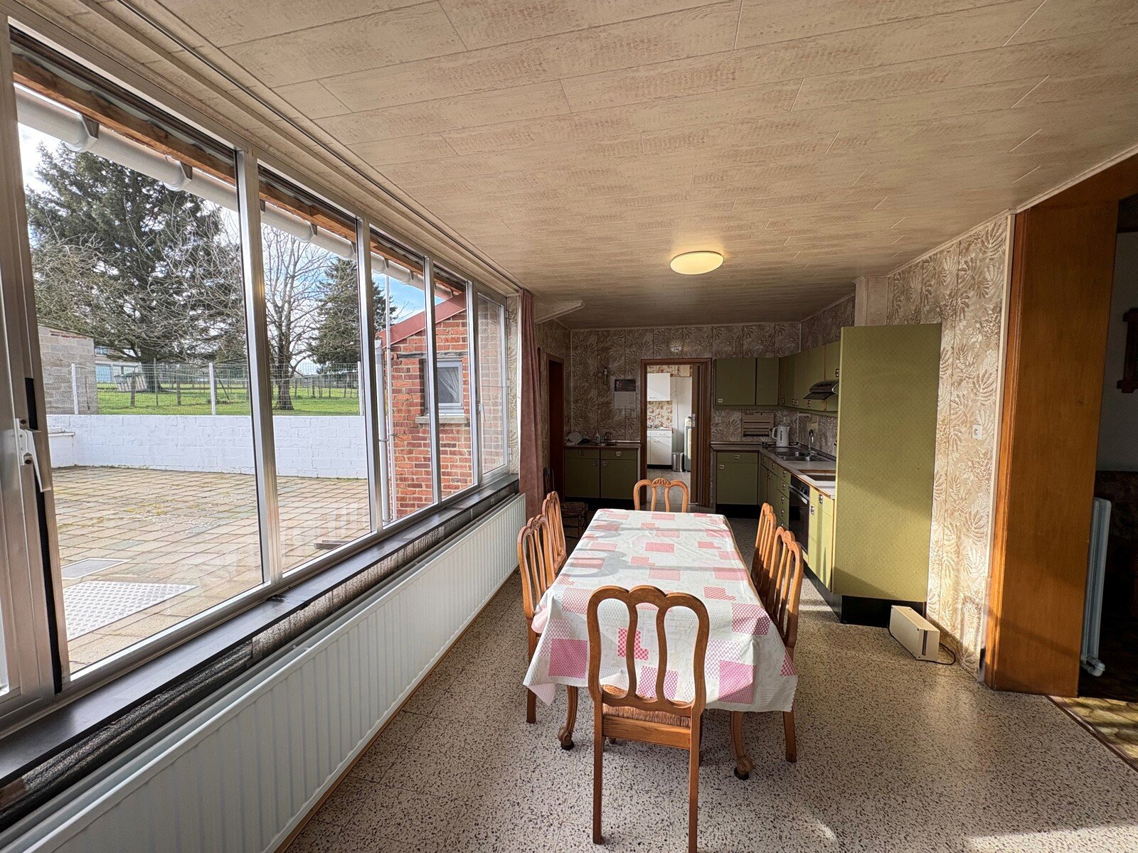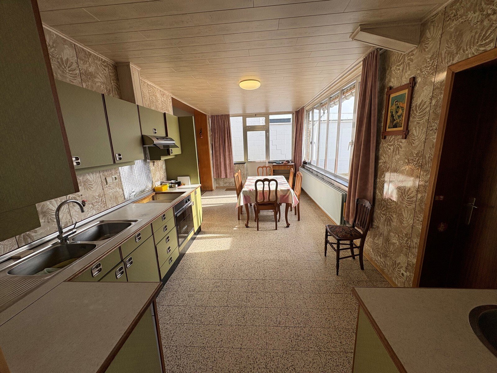 - Keuken + eetplaats (21m²): 7.00x3.00m, geïnstalleerd met lades en onder- en bovenkasten en uitgerust met een warmeluchtoven, dampkap en dubbele spoelbak. Mooi zicht op en toegang tot het terras en de tuin. Tegelvloer.