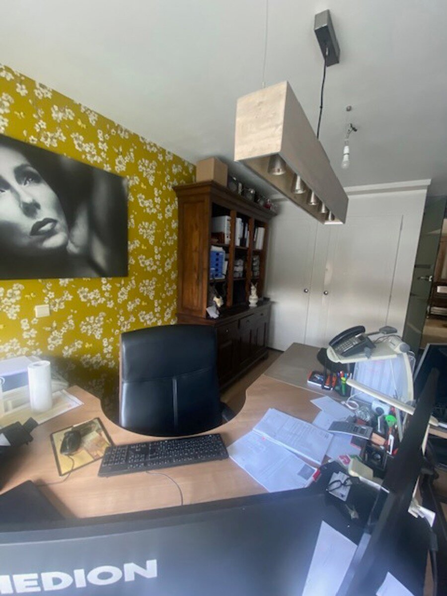 - Bureau 2/traphal (4,10m x 3,10m = 12,71m²): bureau met onderkasten, trap naar de kelder (leefkelder), tegelvloer.