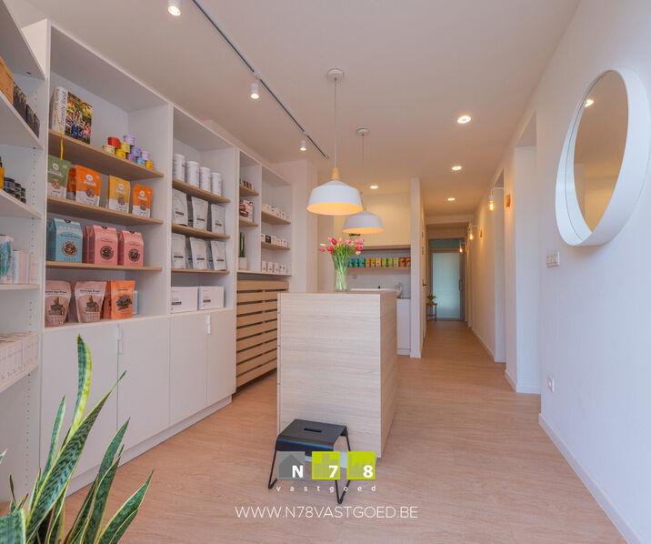 - Onthaal / ontvangstruimte (2,75m x 5,60m = 15,40m²): verkoopbalie, inbouwkasten, leggers, spoelbakje met onderkasten, laminaat.