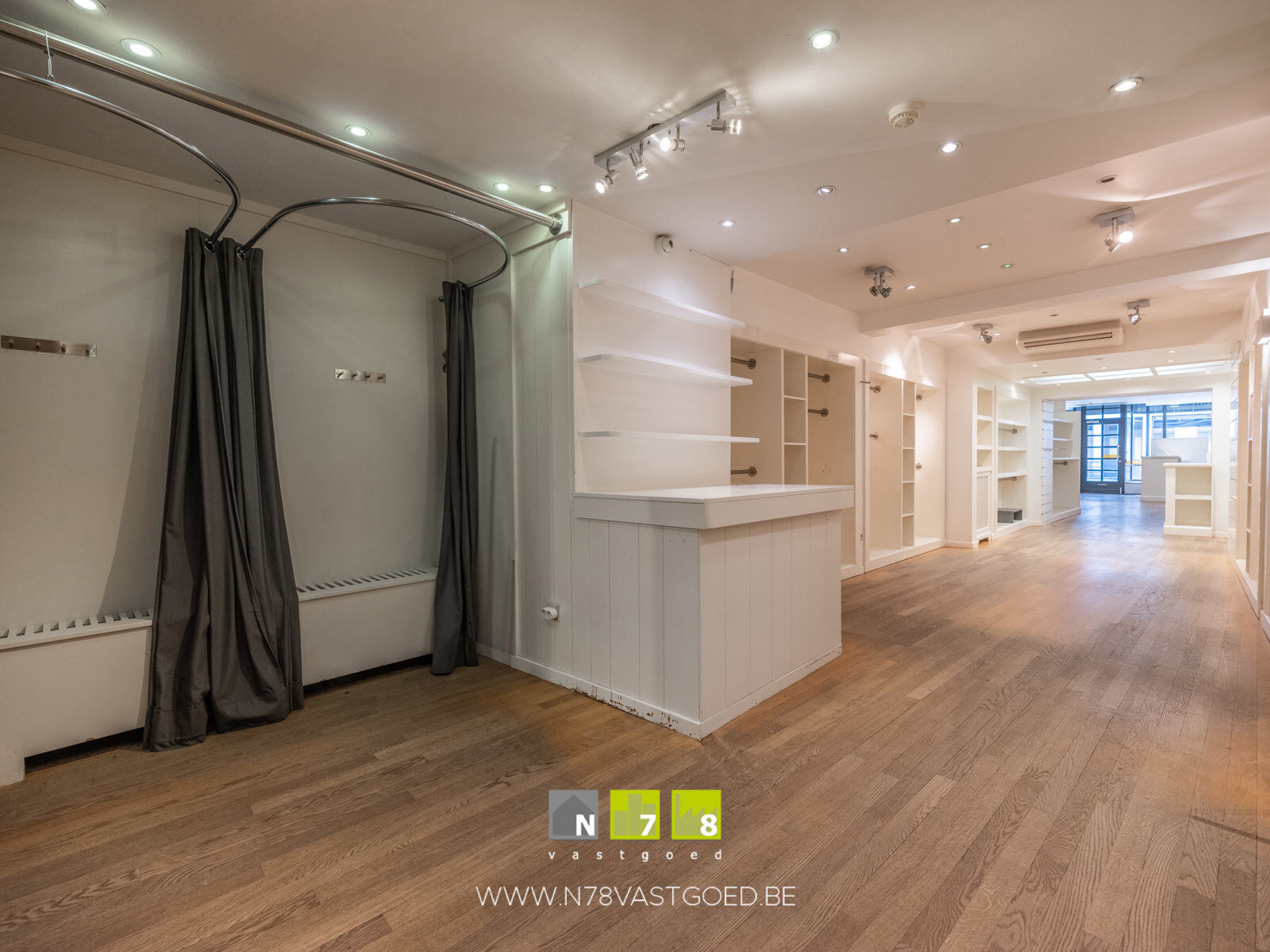 - Handelspand ((6,50m x 7,60m) + (15,00m x 3,15m) + (0,90m x 1,50m) =98,00 m²): momenteel ingericht als kledingwinkel inclusief inbouwkasten, pashokjes, toog, trap naar eerste verdieping (appartement), parketvloer.