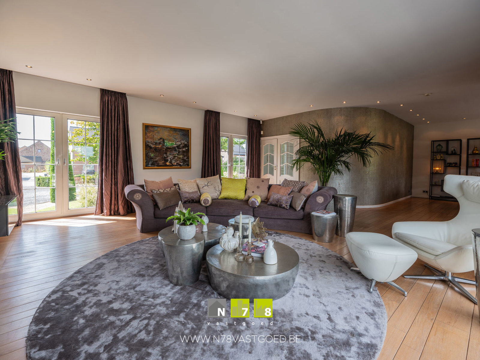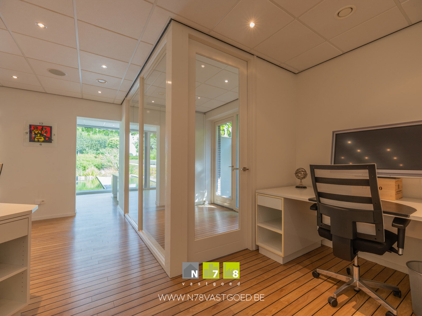 - Kantoor/polyvalente ruimte (6,00m x 7,00m = 42,00m²): aparte zij-ingang, inkomhal, inbouwkasten, ingebouwde luidsprekers, dimbare inbouwspots, alarminstallatie, PVC-vloer (teak look).