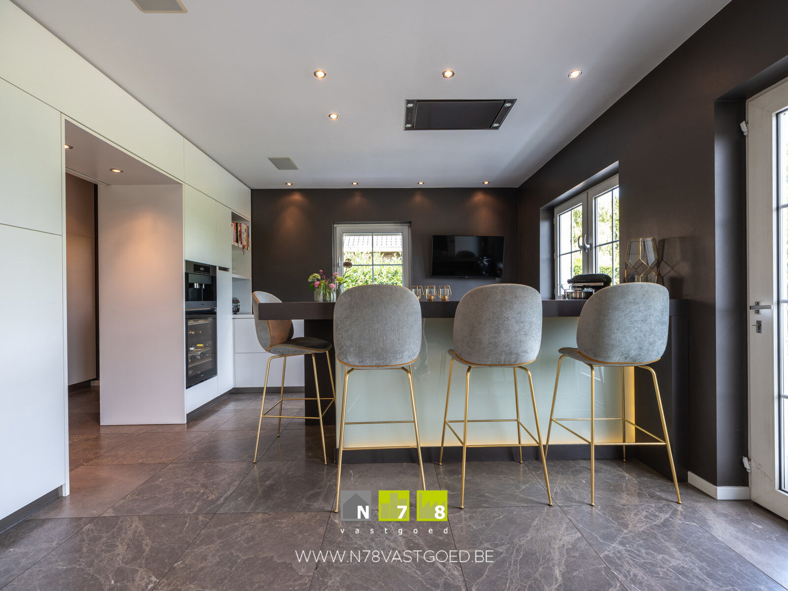 - Keuken (4,30m x 4,20m = 18,06m²): onder- en bovenkasten, koelkast, combi-oven, keukeneiland (koffiezet, wijnkoeler, vaatwasser, inductiekookplaat, dampkap), keukenwand (lades, vaatwasser, dubbele spoelbak), deur naar terras, marmeren vloer.