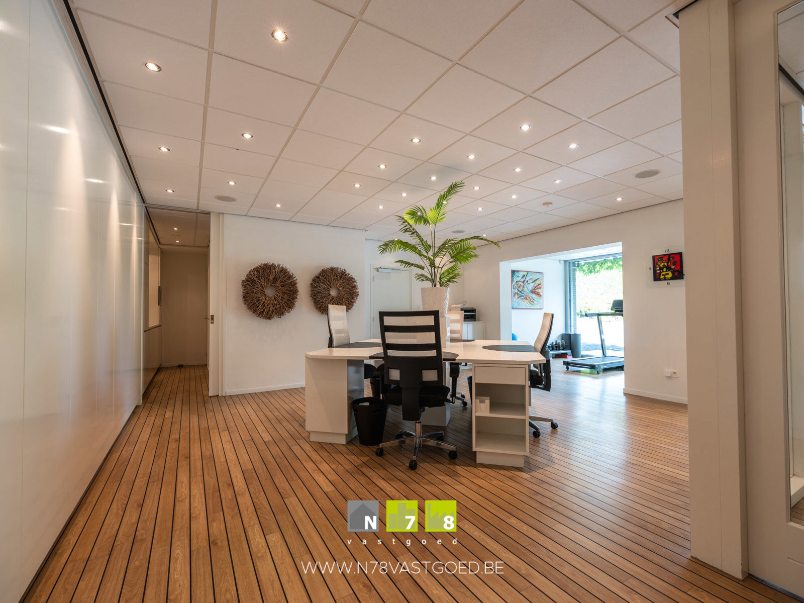 - Bureau (7,15m x 5,30m = 37,90m²): bureau, wandkasten, parketvloer.