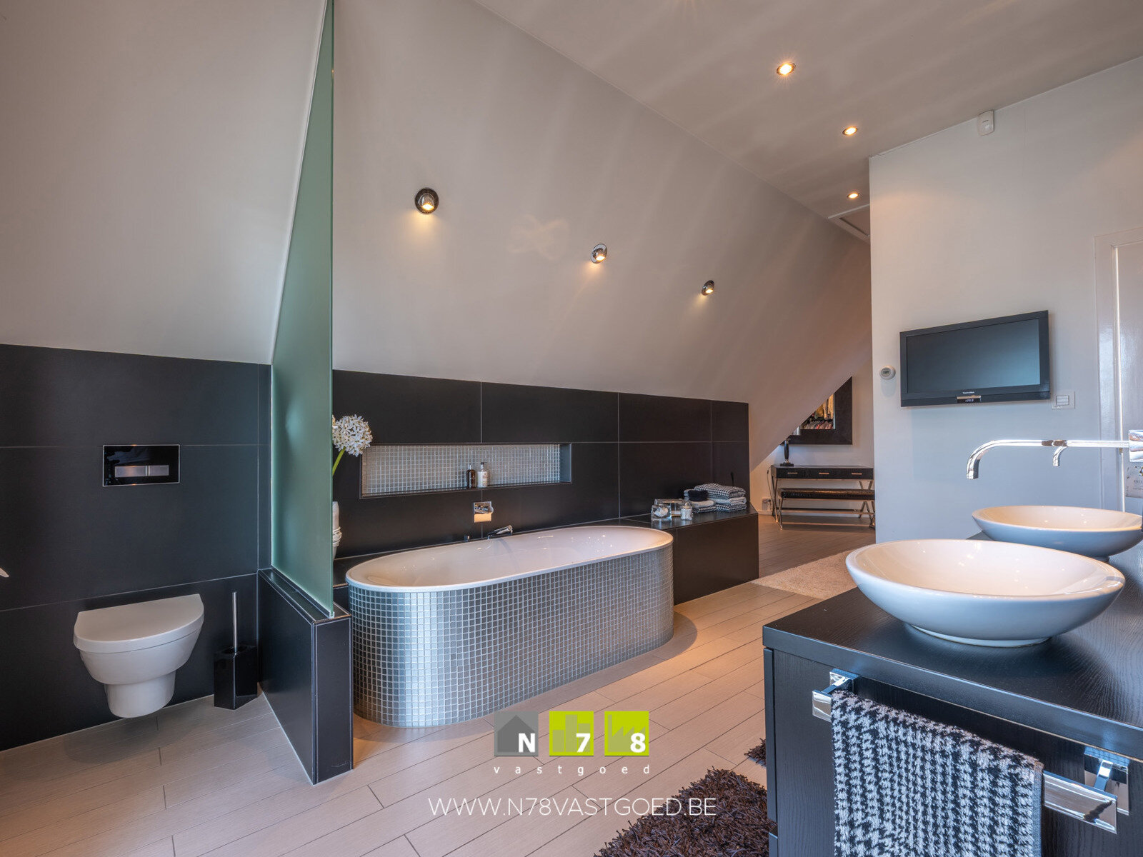 - Badkamer 1 (3,80m x 4,30m = 16,34m²): ligbad, badkamermeubel (dubbele lavabo, lades), (regen)douche/stoomcabine, hangtoilet, toegang tot balkon, TV-aansluiting, dimbare spots, vloerverwarming, tegelvloer.