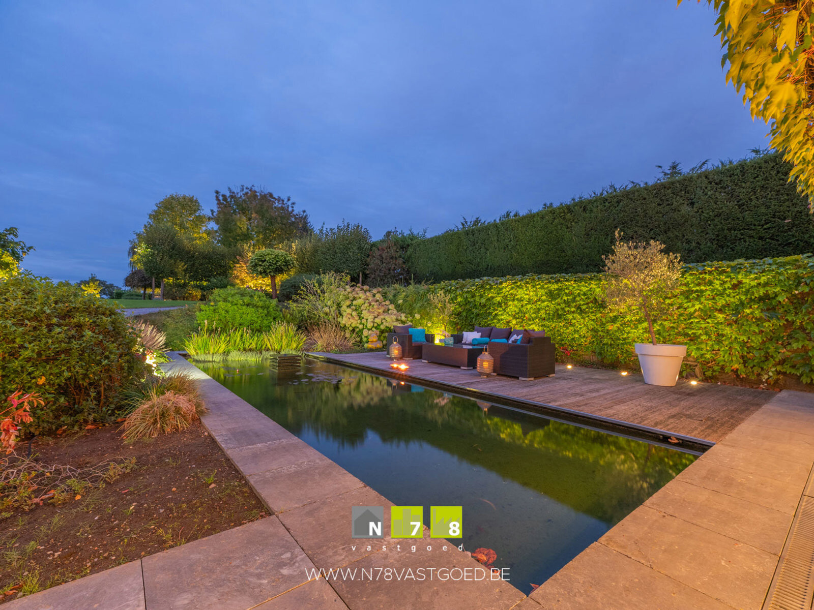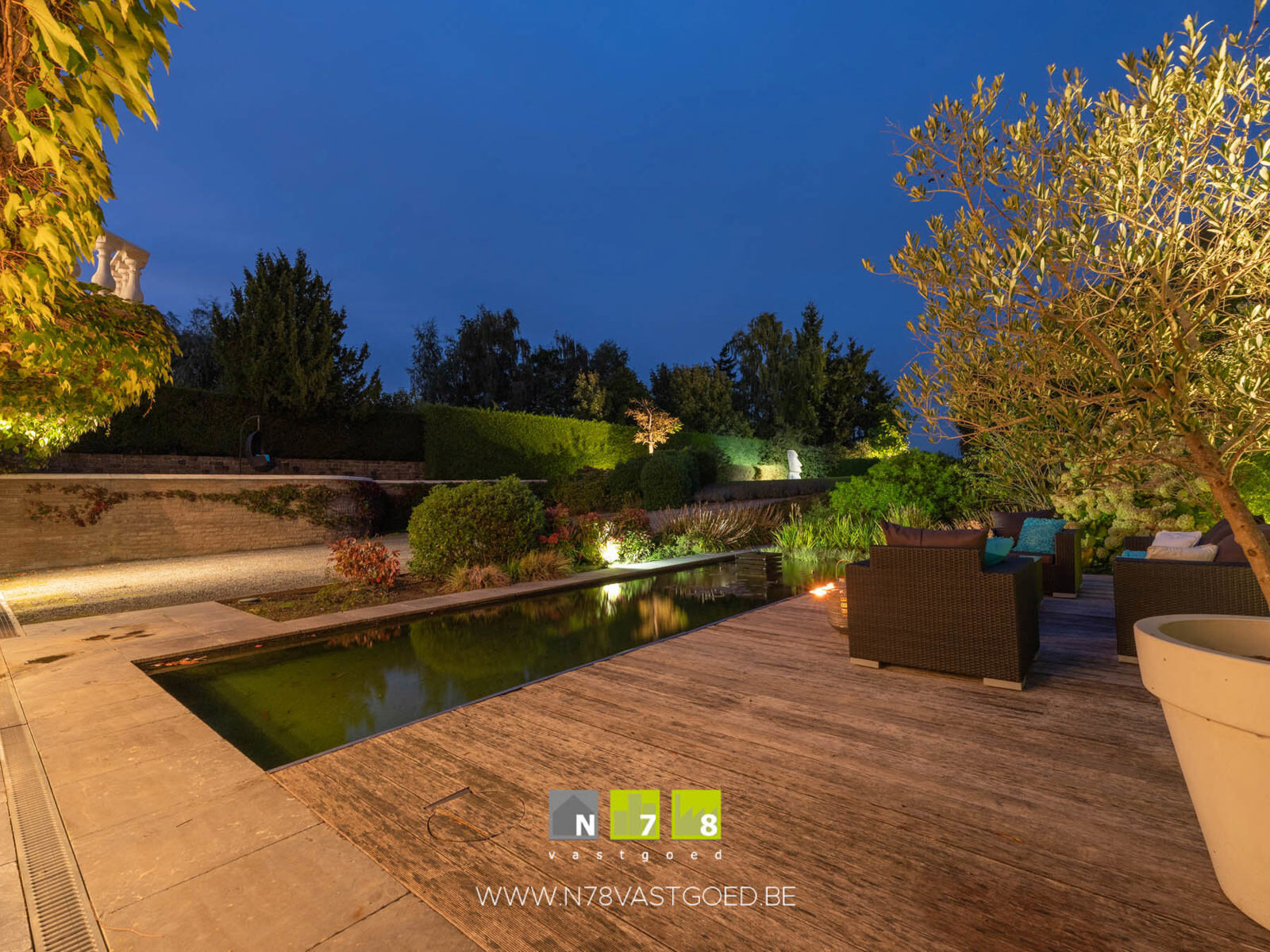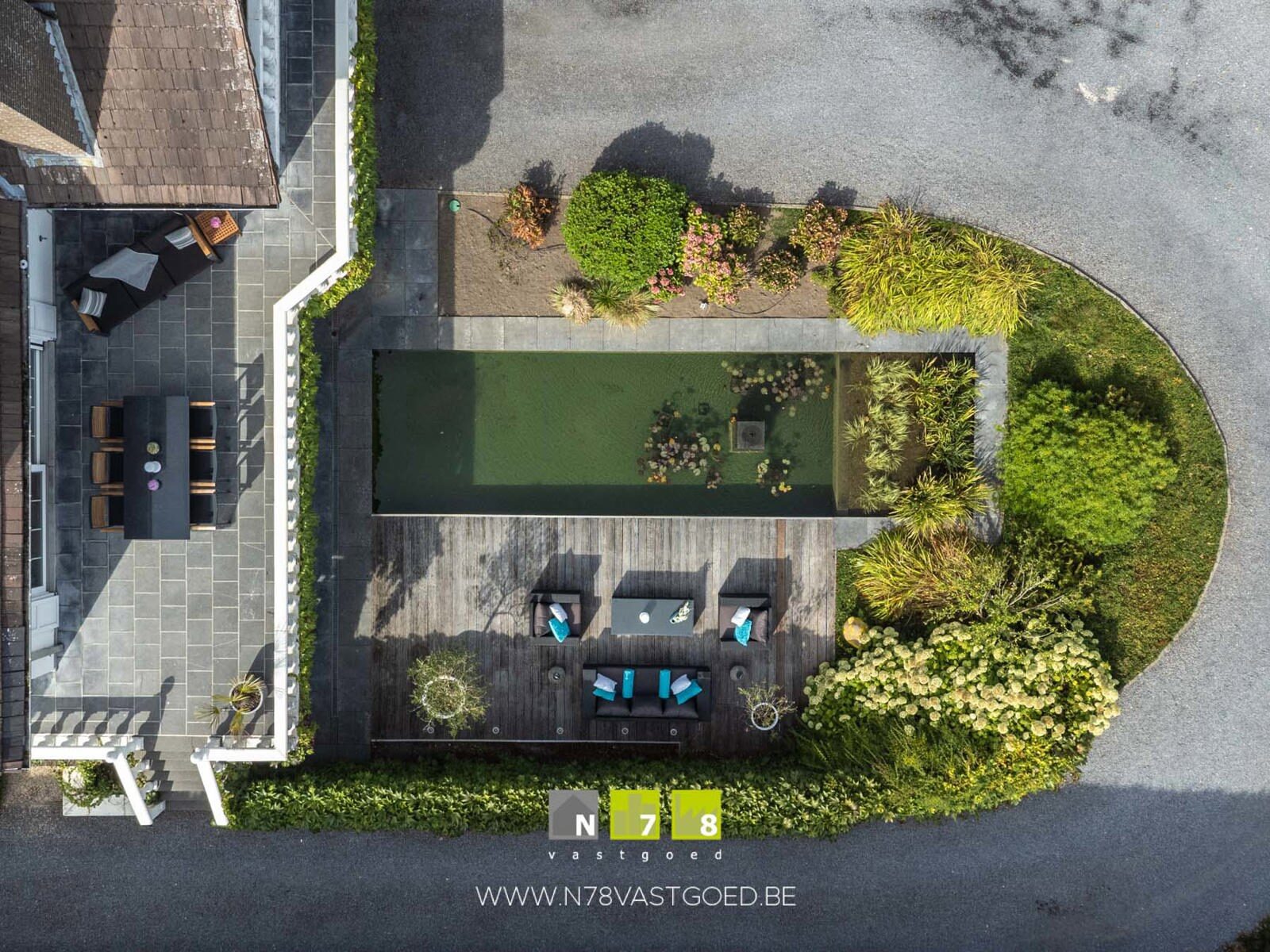 - Vijverpartij (3,00m x 9,00m = 27,00m²): filterinstallatie.