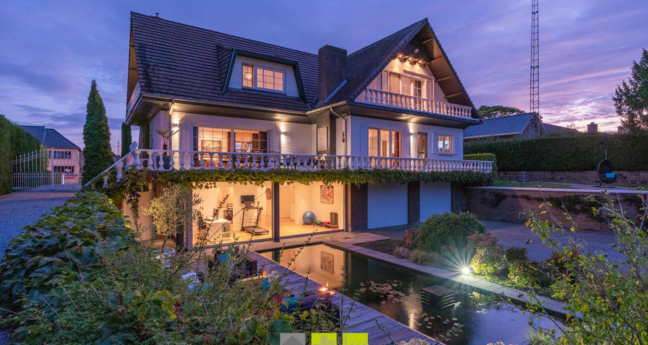 - Buitenruimte met vijverpartij, terrassen, tuinhuis en automatische toegangspoort, volledig voorzien van beregeningssysteem.