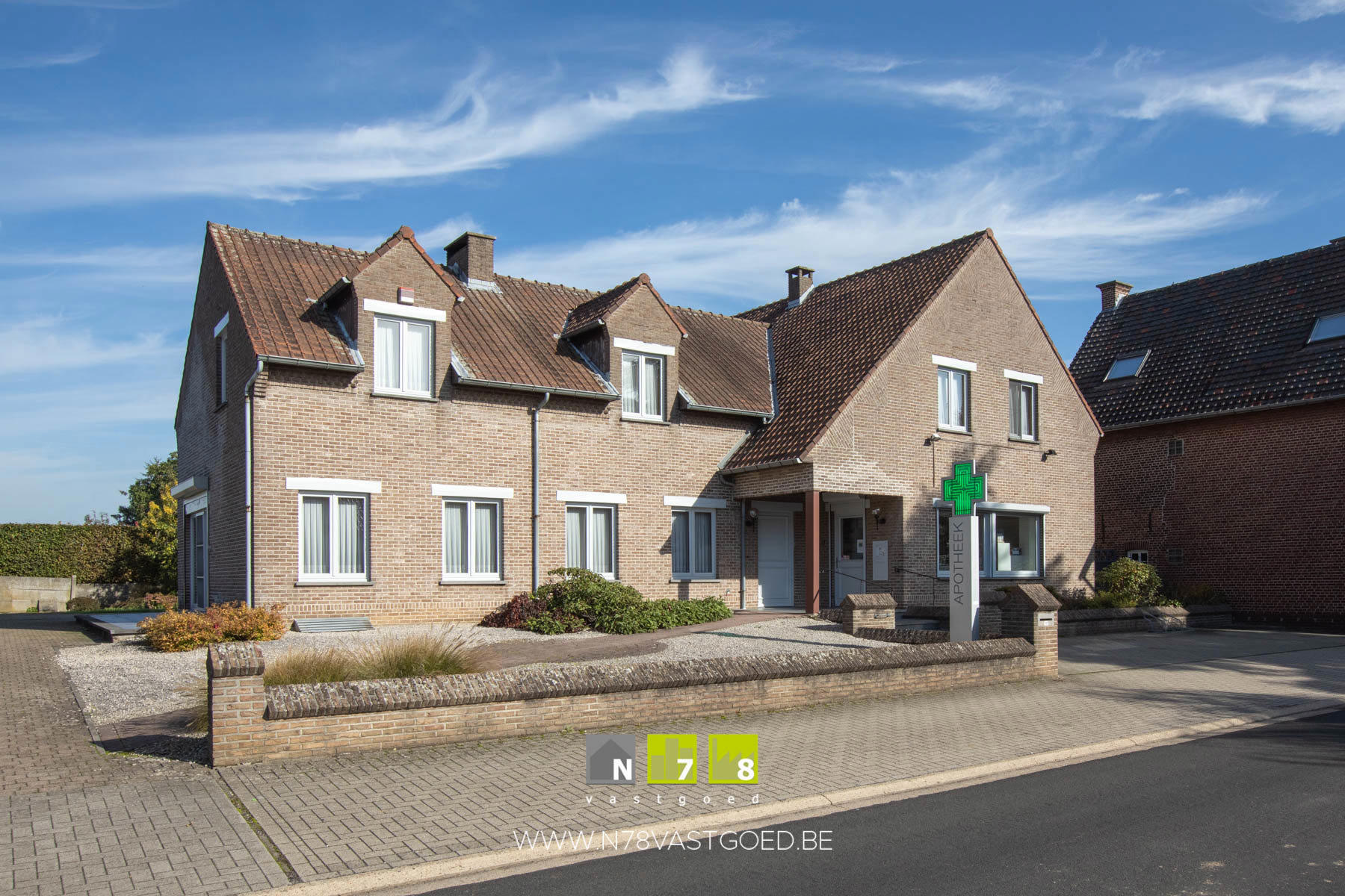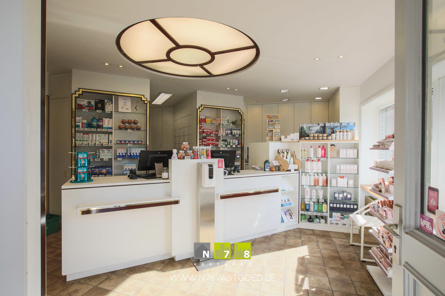 - Handelsruimte (5,80m x 6,50m = 37,70m²): momenteel apotheek, ingericht met inbouwkasten, lavabo, tegelvloer.