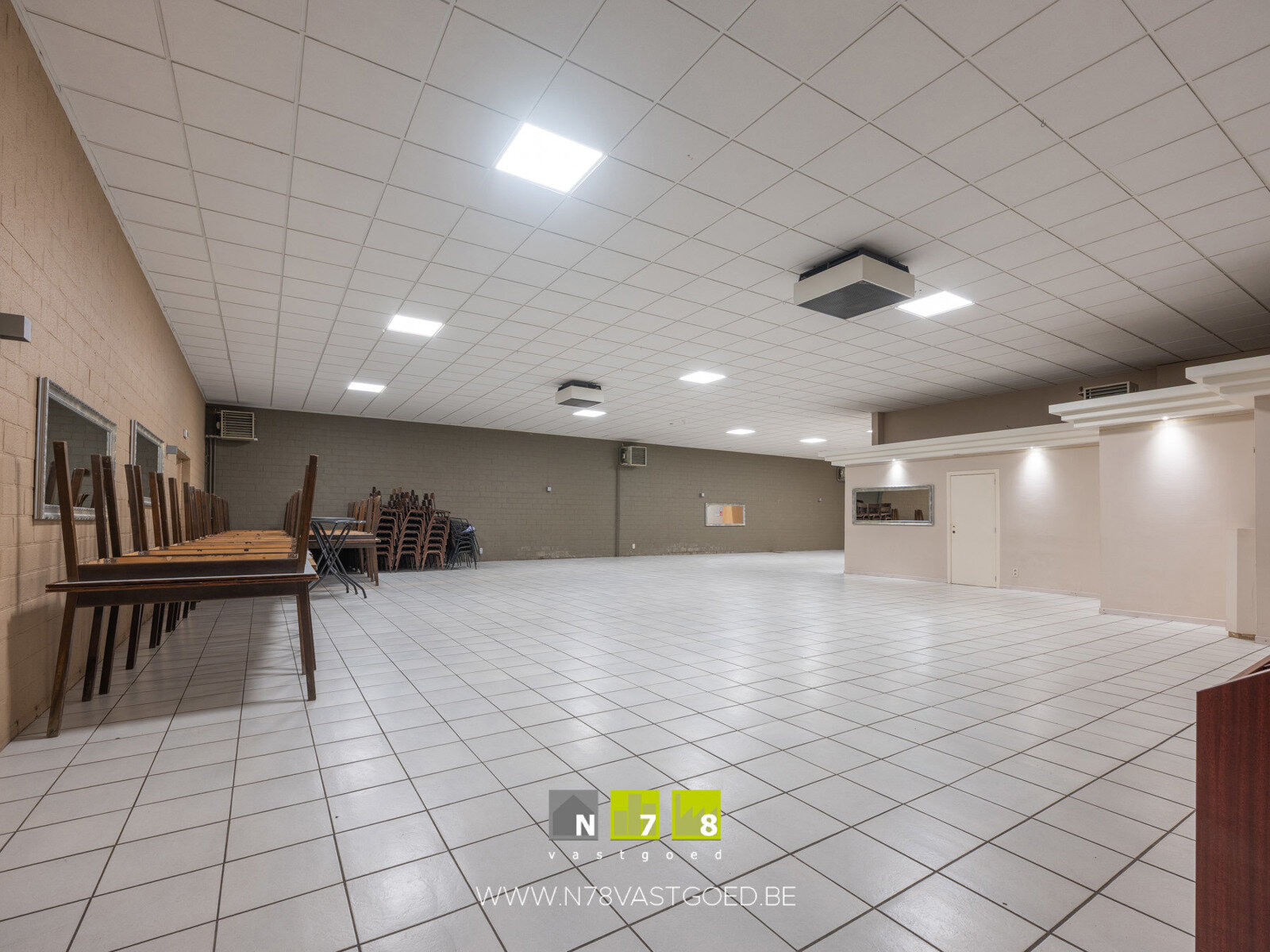 - Feestzaal + sanitair (11,91m x 18,71m = 222,8m²): geïnstalleerd met toog en frigo's, voorzien van 2 nooduitgangen, doorgang naar tuingedeelte, uitgerust met airco-installatie, tegelvloer.