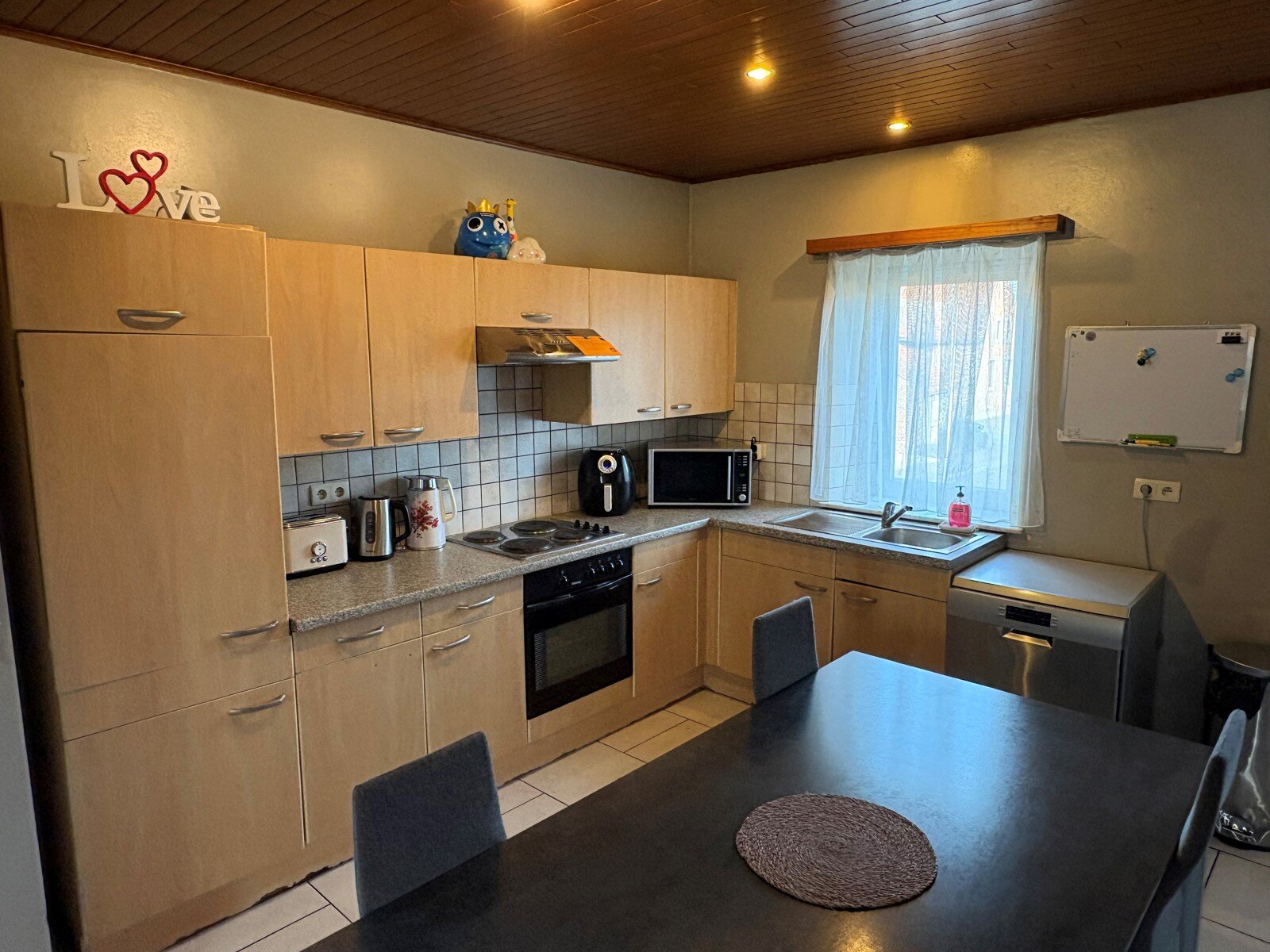 - Leefruimte met open keuken (36m²): bestaande uit de zithoek (22m²: 4.40x5.00m) met de trap naar de bovenverdieping en de eetplaats met de open keuken (14m²: 4.11x3.56m), geïnstalleerd met lades en onder- en bovenkasten en uitgerust met een fornuis met elektrisch kookplaat en warmeluchtoven, een ingebouwde koelkast, dampkap en een spoelbak. Zicht op de tuin. Overal tegelvloer.