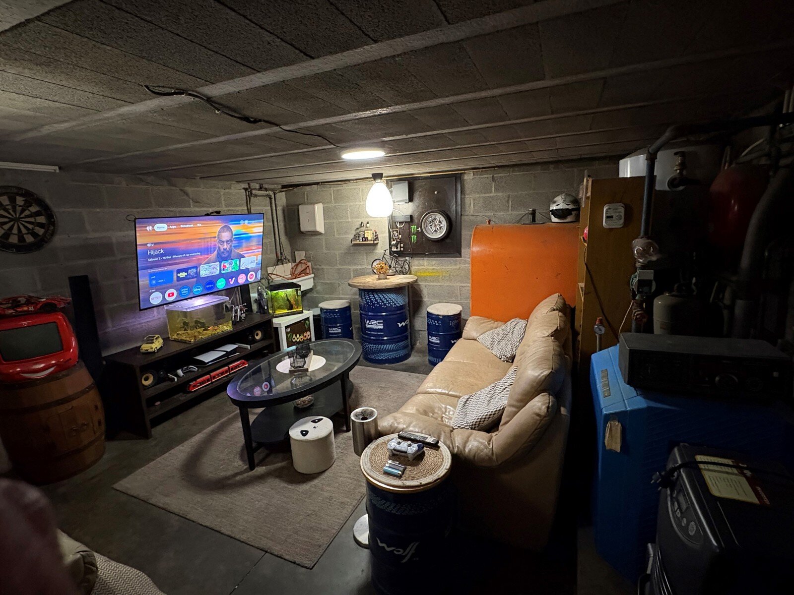 - Inpandige garage (36m²): 8.00x4.50m met een manuele kantelpoort en een uitgietbak. Deels ingericht. Hier staat ook de in 1996 geplaatste Buderus CV-ketel op mazout. Betonvloer.
