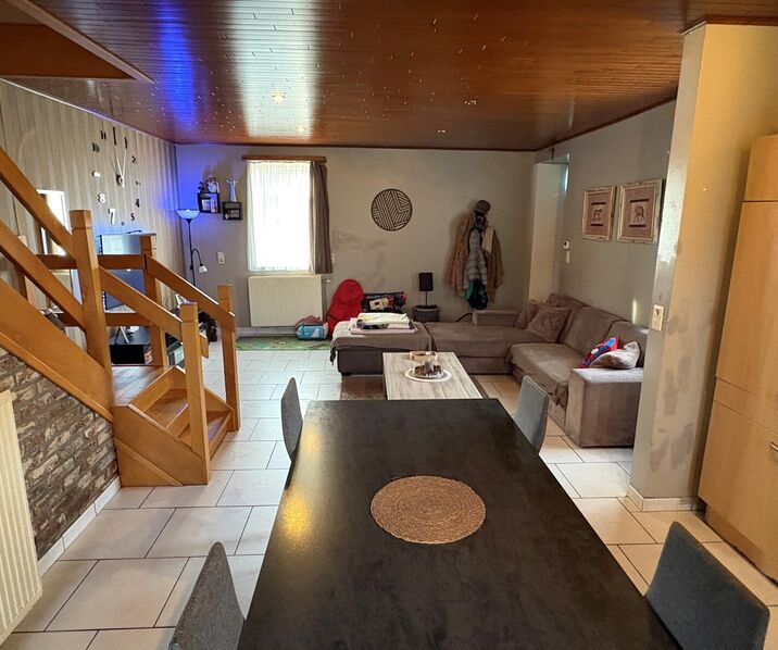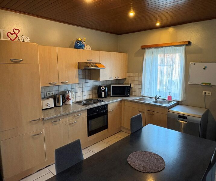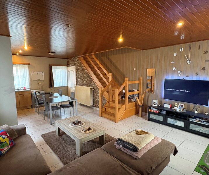 - Leefruimte met open keuken (36m²): bestaande uit de zithoek (22m²: 4.40x5.00m) met de trap naar de bovenverdieping en de eetplaats met de open keuken (14m²: 4.11x3.56m), geïnstalleerd met lades en onder- en bovenkasten en uitgerust met een fornuis met elektrisch kookplaat en warmeluchtoven, een ingebouwde koelkast, dampkap en een spoelbak. Zicht op de tuin. Overal tegelvloer.