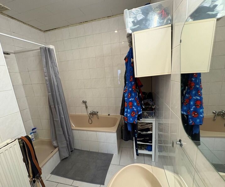 - Badkamer (6m²): 2.85x1.66/2.50m, uitgerust met zowel een ligbad als een douche en een lavabo. Ruimte voorzien van volledige wandbetegeling en tegelvloer.