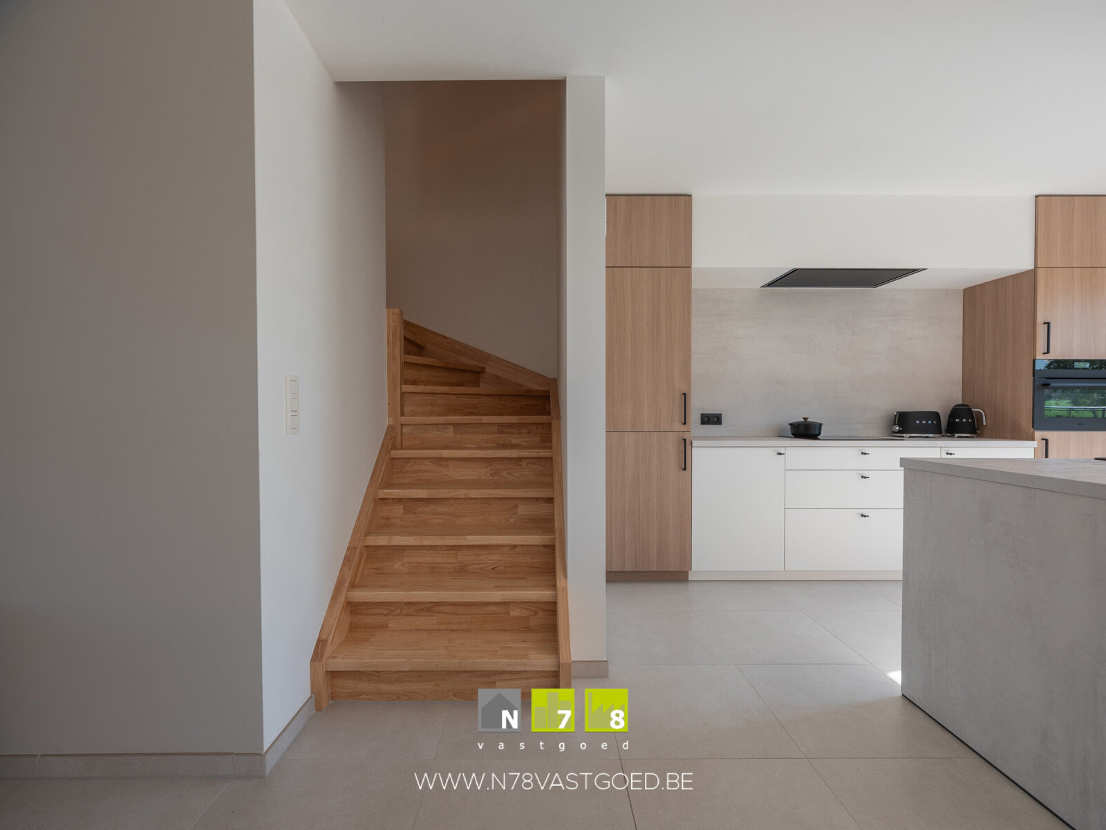 - Woonkamer (8,74 m x 4,15 m = 36,27 m²): open leefruimte met veel lichtinval en verbonden met de keuken, schuifpui naar tuin/terras, houten trap naar eerste verdieping, tegelvoer.