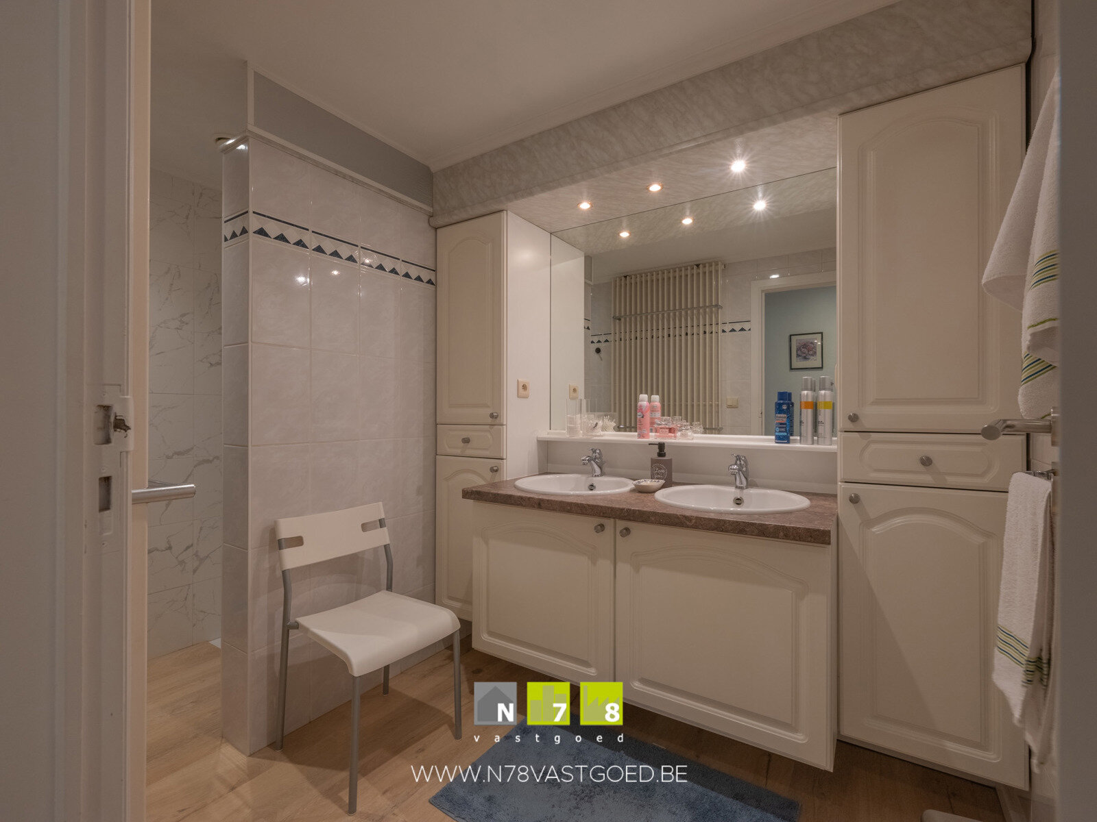 - Badkamer (1,75m x 3,05m = 5,34m²): badmeubel met 2 lavabo's, onderkasten, lades, kolomkasten; inloopdouche, wandbetegeling, PVC vloer.