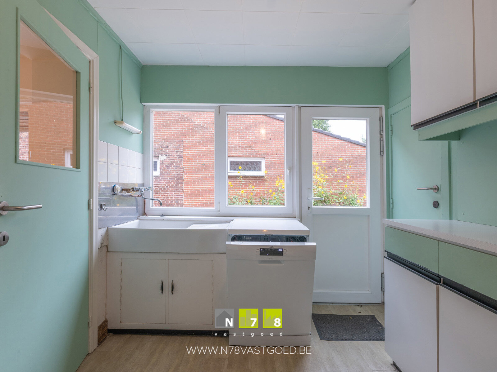 - Keukenruimte 1 (3,30m x 6,60m = 21,78m²): nog volledig te installeren; novilon.