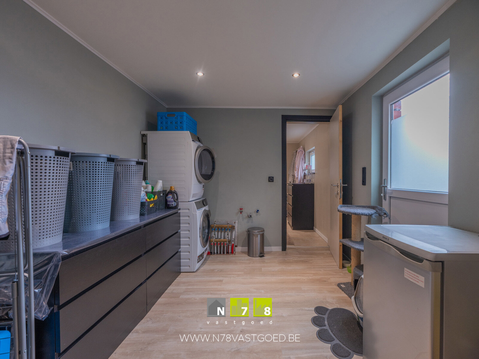 Wasplaats (3,30m x 2,60m =8,58m²): deur naar tuin, aansluiting wasmachine en droogkast, aansluiting uitgietbak, laminaatvloer.