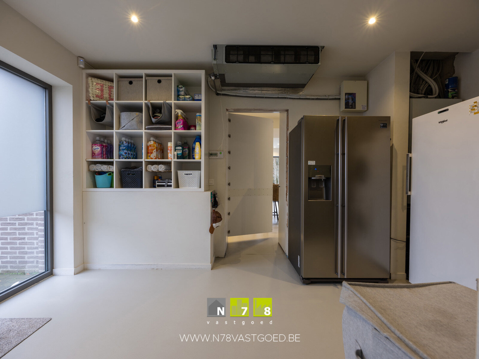 - Berging (4,20m x 3,93m = 16,51m²): aansluiting wasmachine & droogkast, badmeubel met enkele lavabo en onderlades, inloopdouche, toegang zijkant woning, epoxy gietvloer.