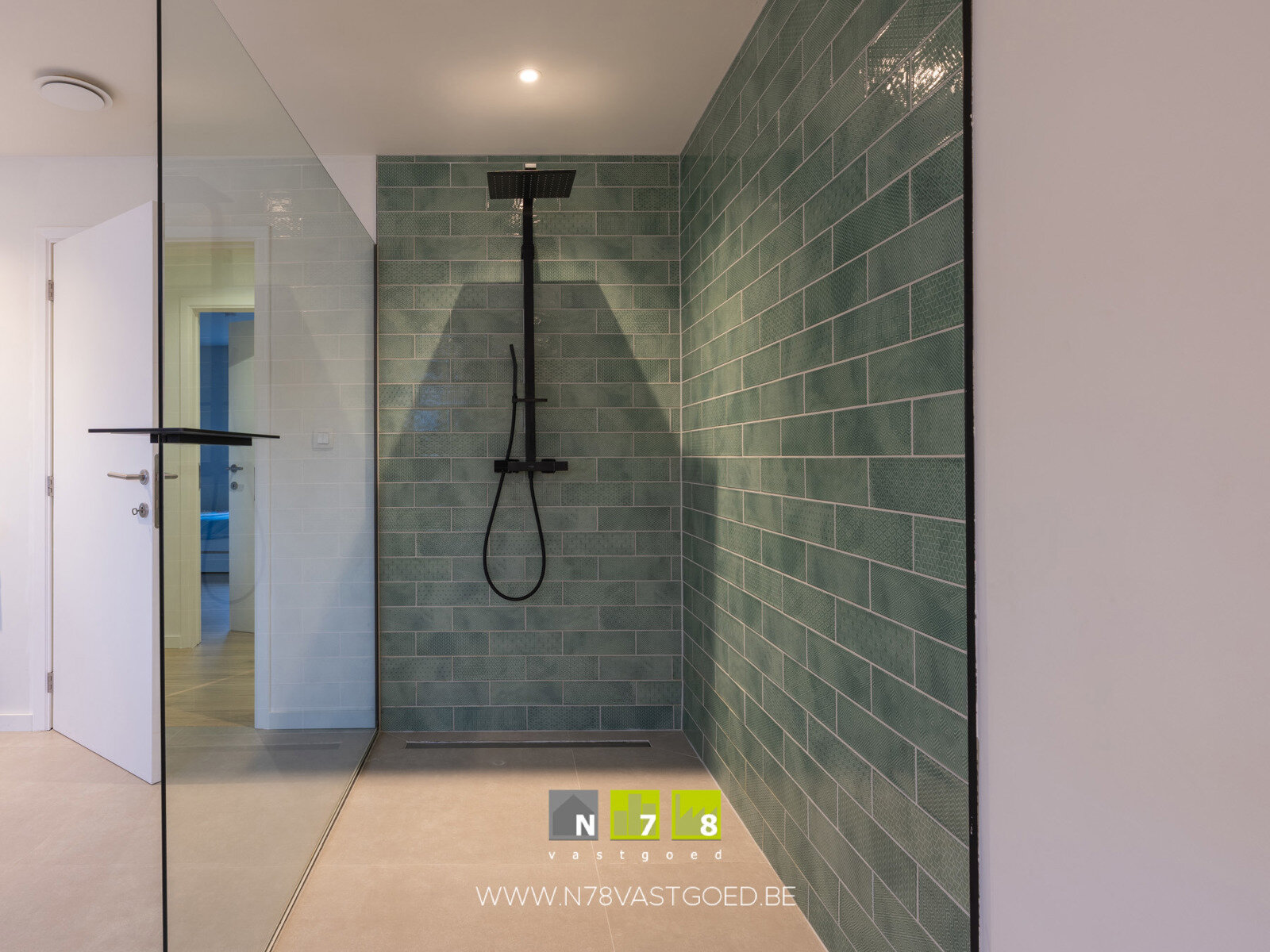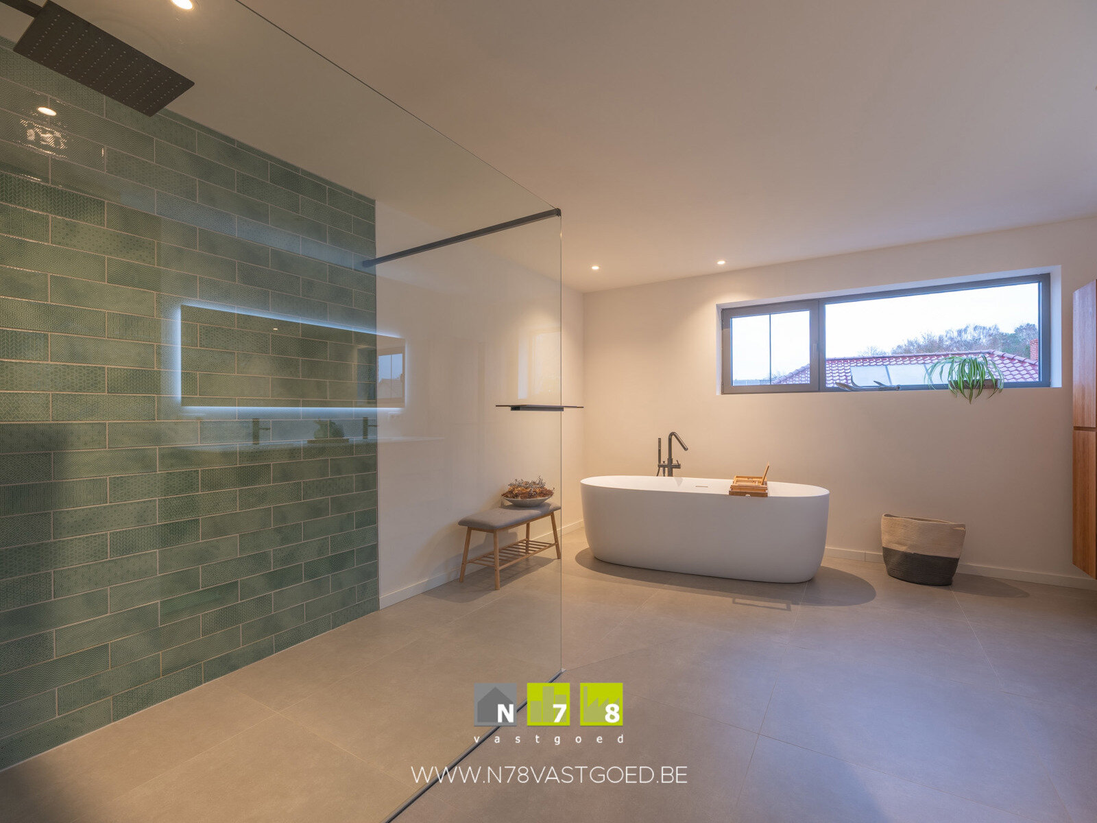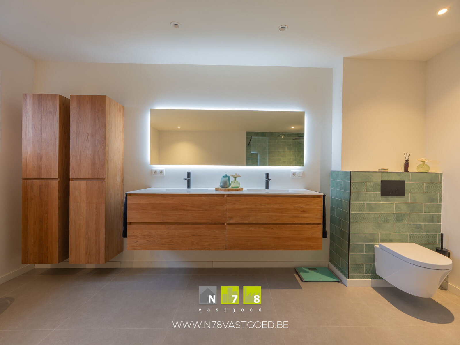 - Badkamer (4,20m x 3,93m = 16,51m²): ingericht badmeubel met dubbele lavabo, lades, kolomkasten, spiegel met LED verlichting; ligbad, ruime inloopdouche met wandbetegeling, hangtoilet, keramische tegel.