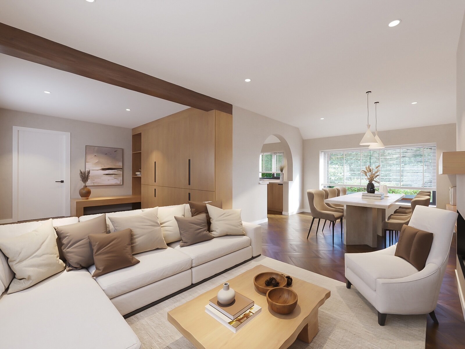 - Woonkamer (6,65m x 3,58m + 3,55 x 3,90)= 31,26m²): L-vormige open ruimte, verschillende raampartijen, radiatoren, aansluiting voor kachel, laminaatvloer.