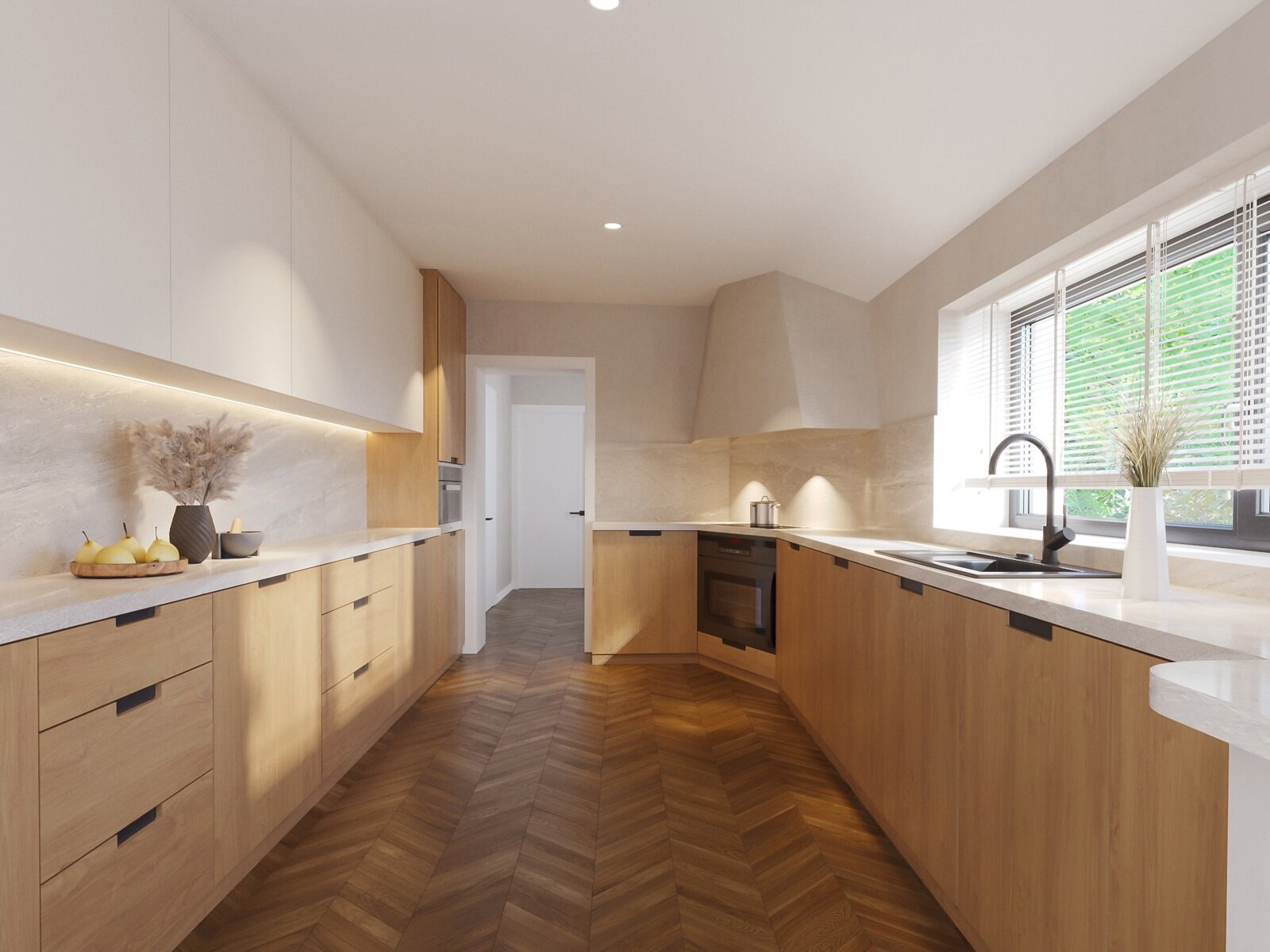 - Keuken (3,80m x 3,00m = 11,40m²) Geïnstalleerde keuken met onder-en bovenkasten, lades, kolomkast, keramische kookplaat, dampkap, koelkast en vaatwasser, laminaatvloer.