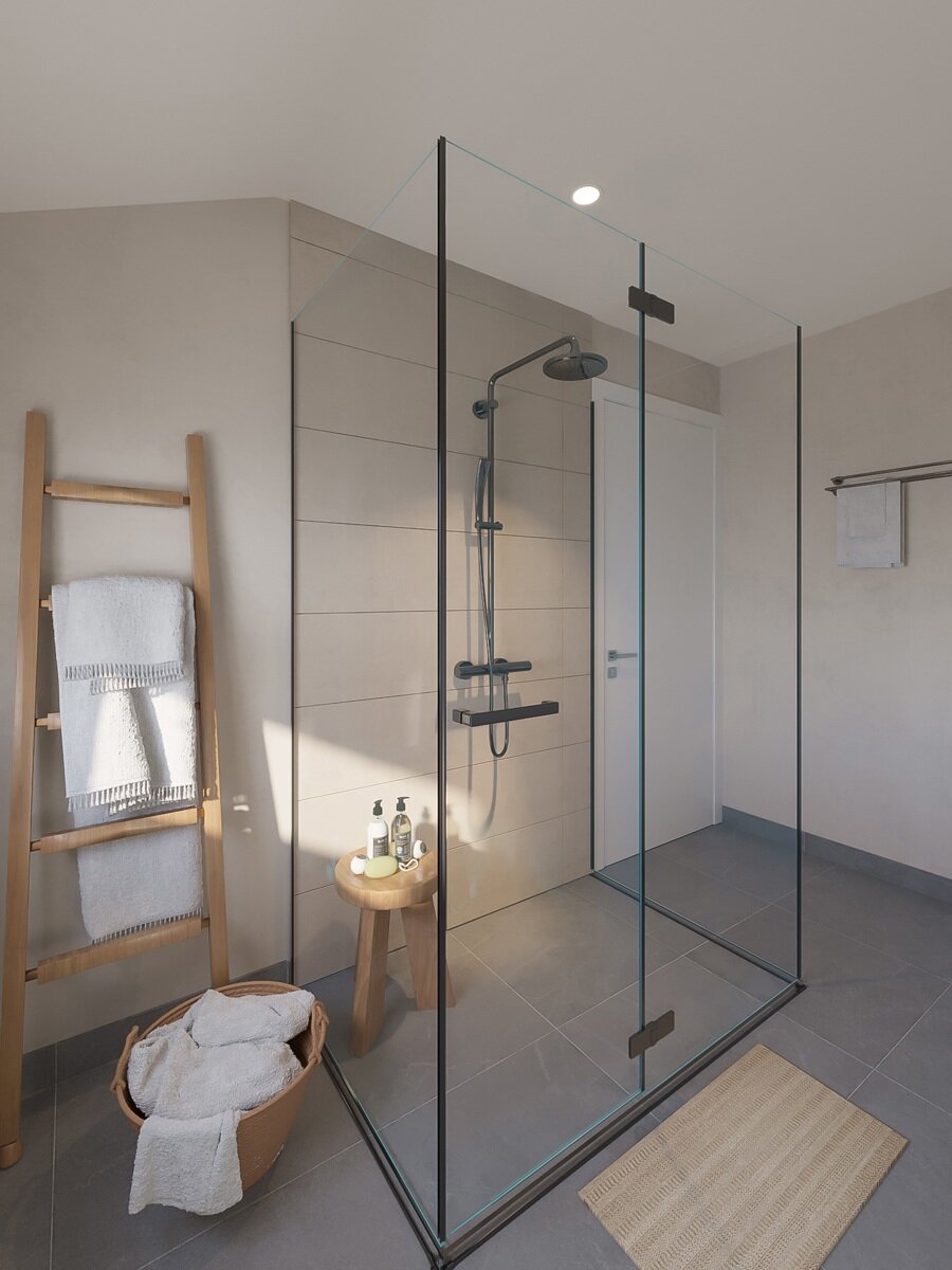 - Badkamer (2,95m x 2,61m = 7,70m²): badkamermeubel met enkele lavabo, onderkast, kolomkast, lades, spiegel, aparte douche, betegelde muren, laminaatvloer.