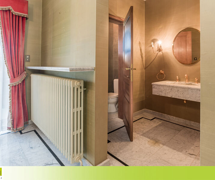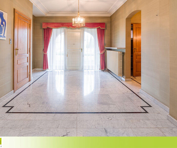 - Inkomhal 1 met apart toilet (30m²): 5.00x3.60m + 10.50x1.10m, voorzien van een apart toilet met handenwasser, vestiairekasten en trap naar de bovenverdieping. Van hieruit ook rechtstreekse toegang tot de praktijkruimte. Marmervloer.