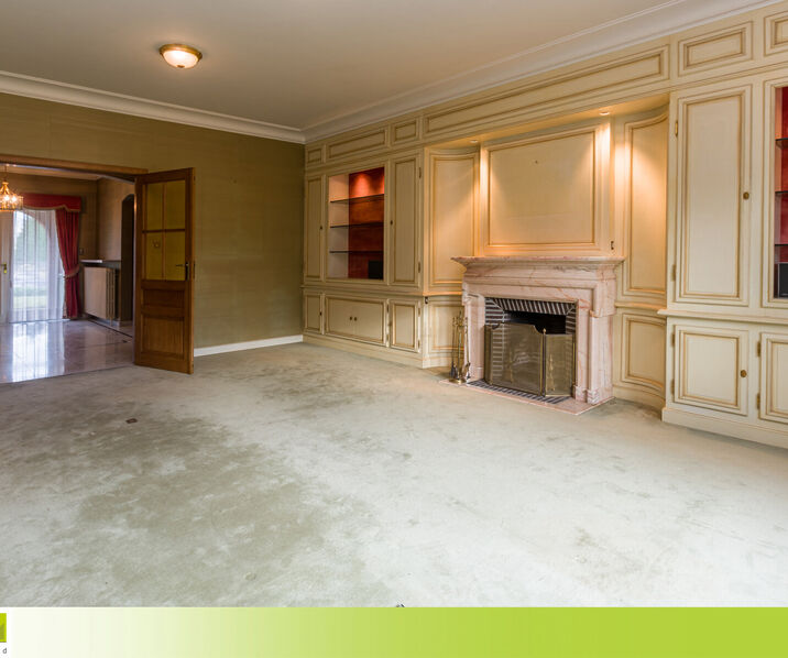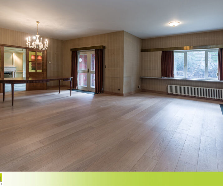 - Leefruimte (81m²): 12.50x6.50m onderverdeeld in een living voorzien van een kastenwand met open haard in een marmeren schouw (vast tapijt) en een woonkamer met toegang tot 2 overdekte terrassen (parketvloer).