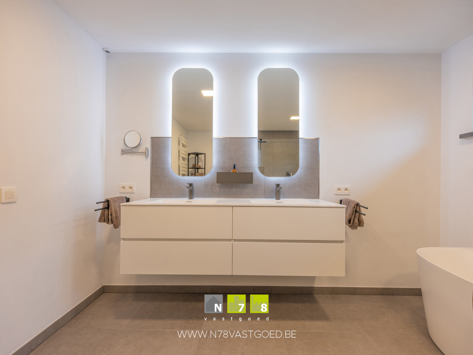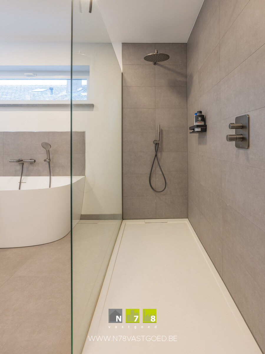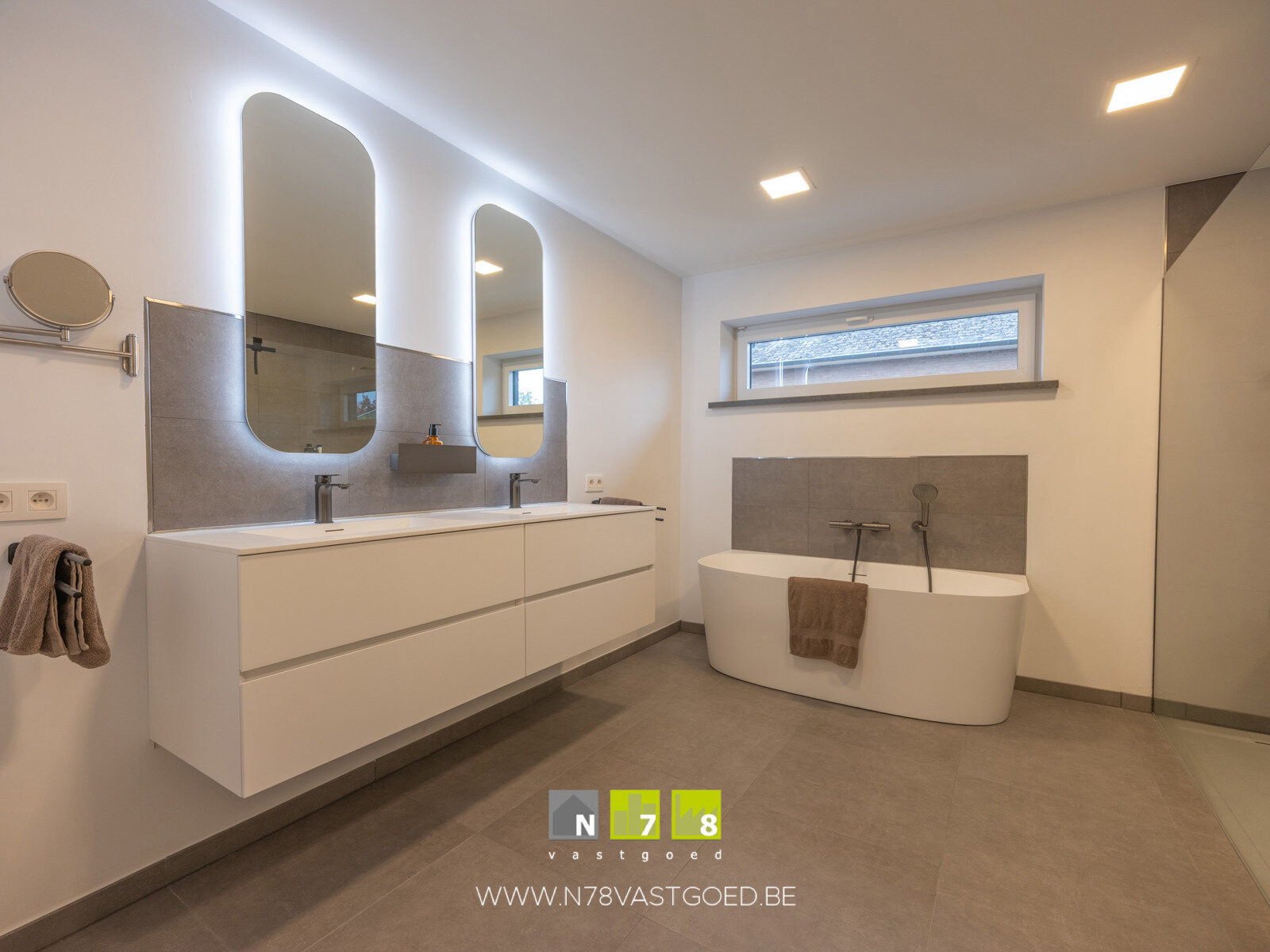 - Badkamer (3,40m x 3,61m = 12,27m²): ingericht badmeubel met dubbele lavabo en onderlades; ligbad, inloopdouche, design handdoekdroger, doorgang naar de wasplaats, tegelvloer.