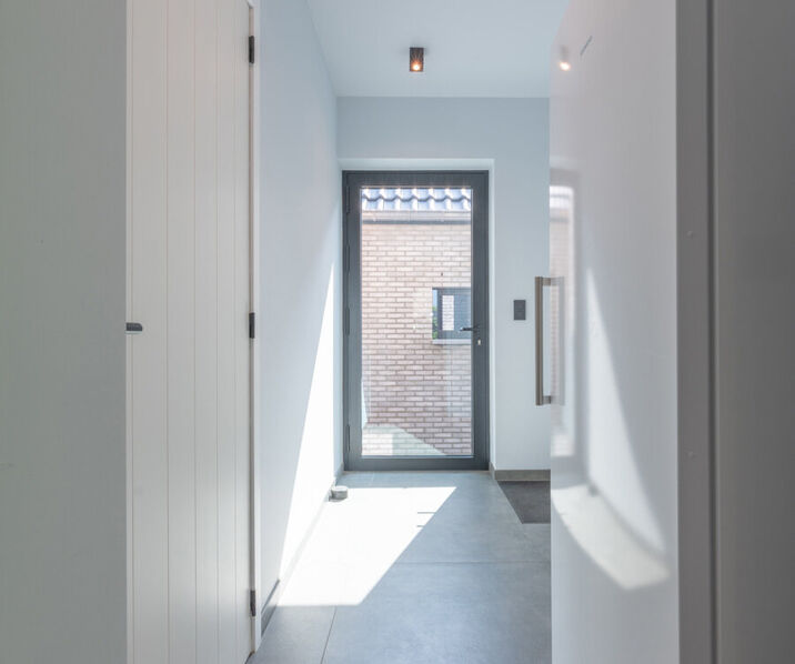- Zitplaats (4,50m x 5,20m = 23,40m²): airco, veel lichtinval, schuifraam naar tuin, indirecte ledverlichting, tegelvloer.