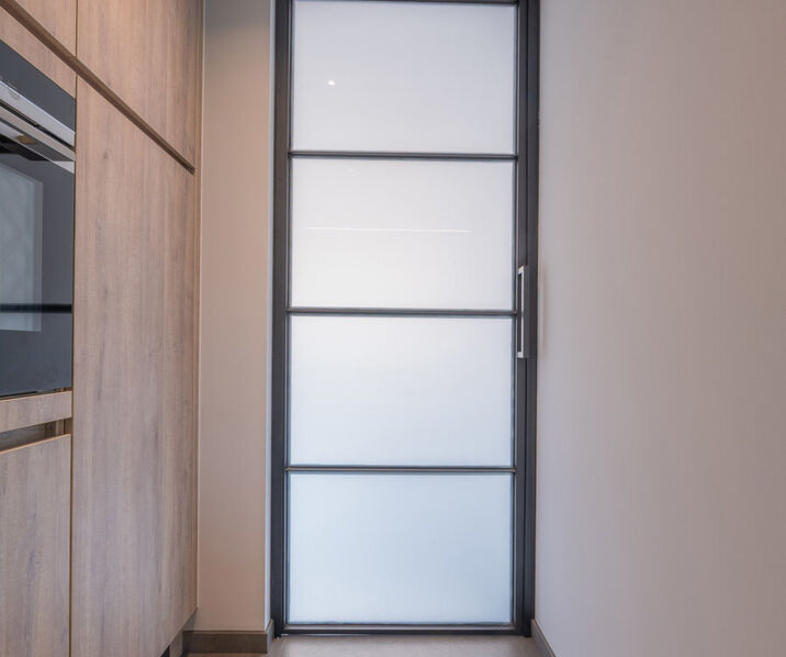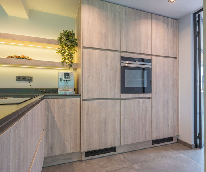 - Keuken (5,20m x 4,31m = 22,41m²): onder- en bovenkasten, lades, kolomkast, inductiekookplaat, ingebouwde dampkap, oven, koelkast, vaatwasser, microgolf inbouw voorzien, granieten werkblad, tegelvloer.
