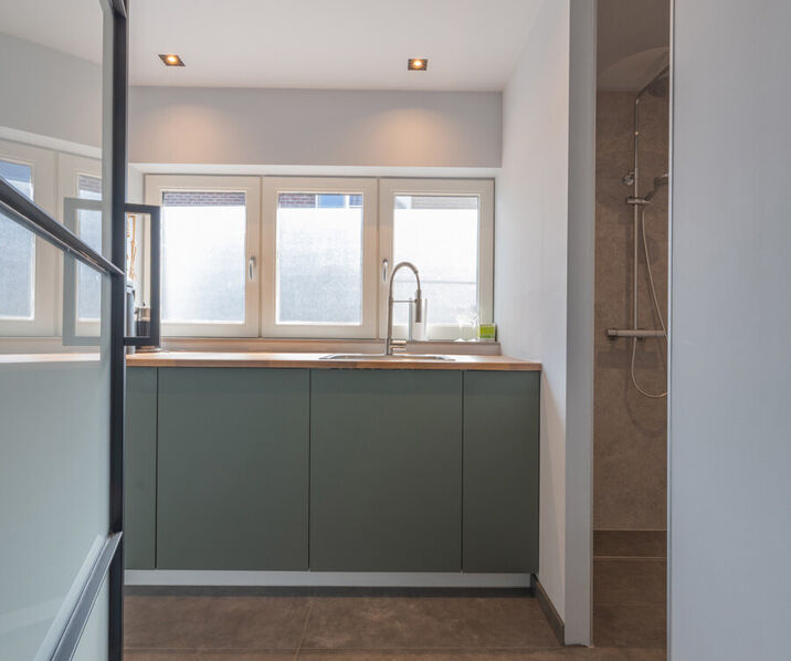 - Berging (3,61m x 4,31m = 15,56m²): douche, spoelbak, inbouw onderkasten, aansluiting wasmachine & droogkast, handdoekdroger, trap naar kelder, tegelvloer.