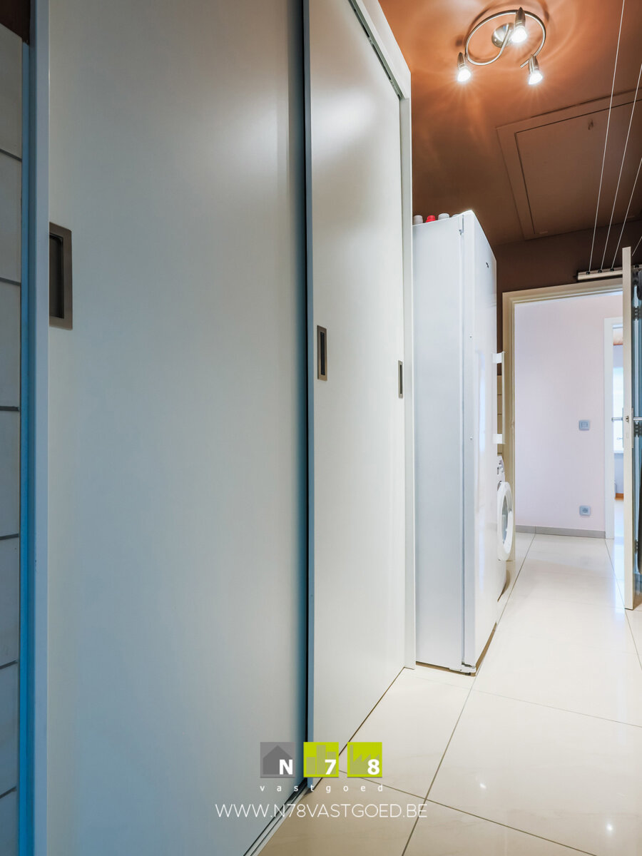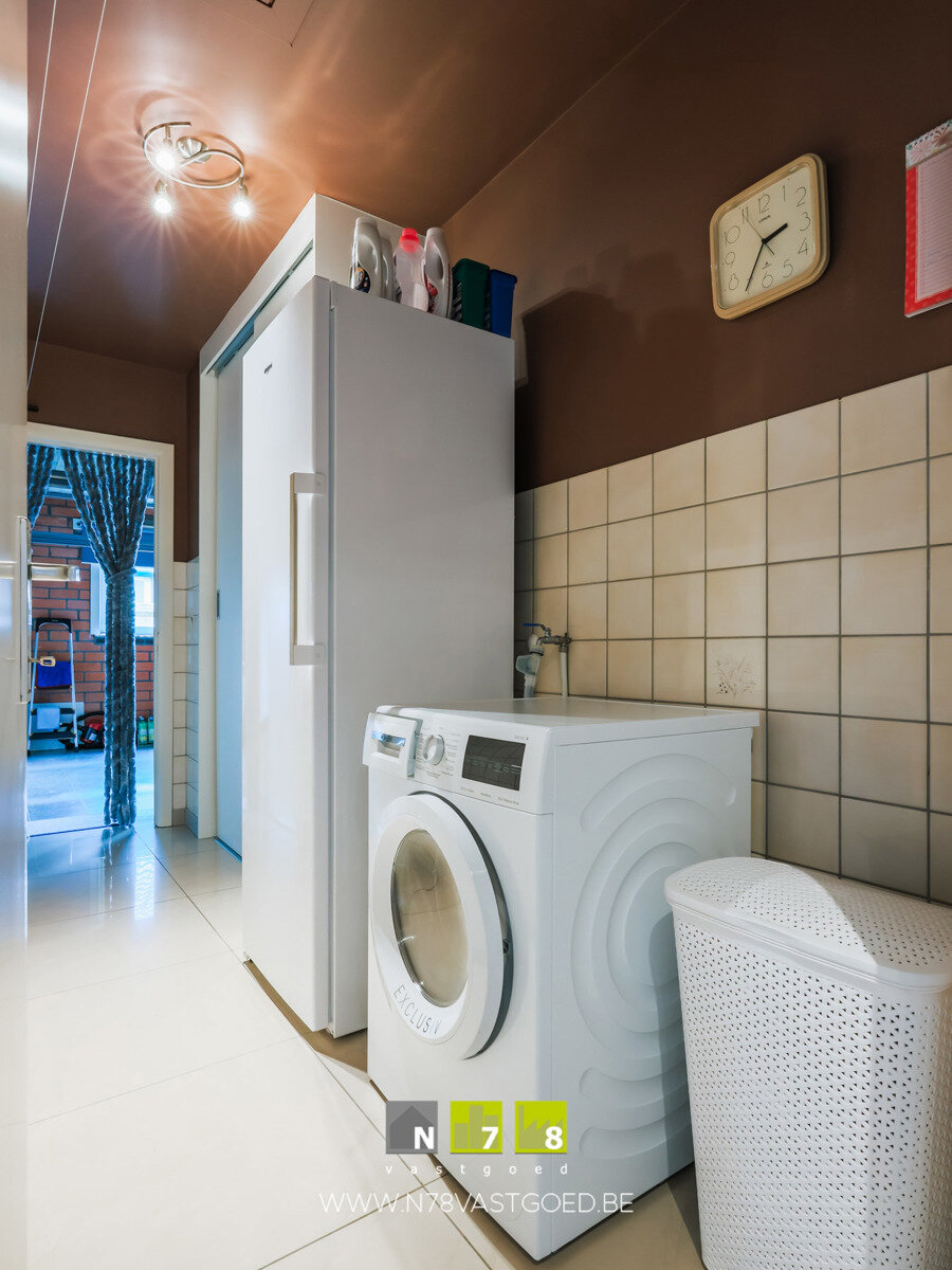 - Berging (1,53m x 3,26m = 4,99m²): inbouwkasten, aansluiting wasmachine en droogkast, toegang naar bergzolder via luik, tegelvloer.